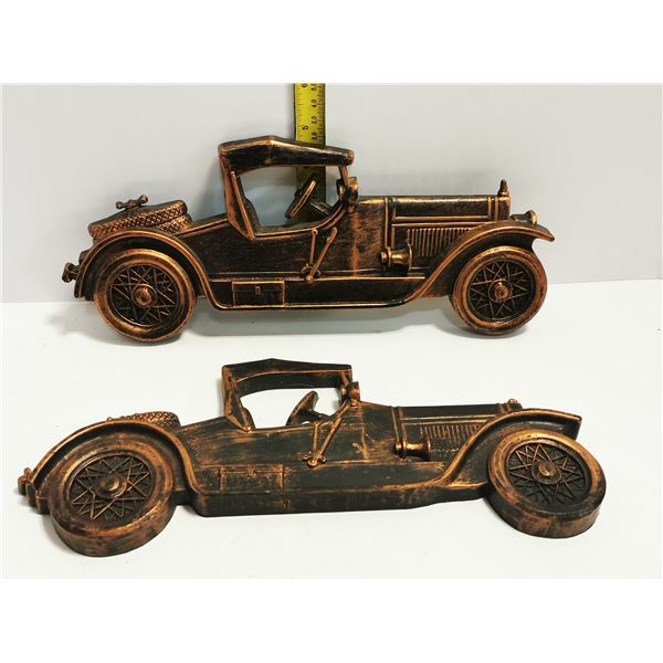 SET OF 2 BRONZE ANTIQUE CARS WALL HANGINGS BLACK PLASTIC86 - SET OF 2 BRONZE ANTIQUE CARS WALL HANGINGS BLACK PLASTIC