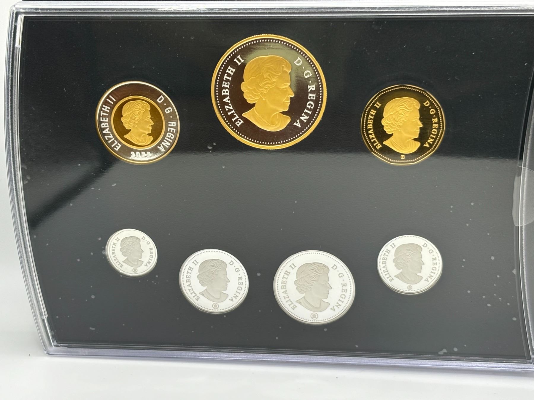 This set’s exclusive proof dollar features a selectively gold-plated reverse design by Canadian artist and RCM translation and official languages specialist, Armand Nina. Its word-art portrait of inventor Alexander Graham Bell (1847-1922) is composed of various words that represent different aspects of his life, accomplishments and legacy. An experimental model of Bell’s most famous contribution to science and technology, the telephone, appears to the left of the inventor, while Bell’s signature appears near the rim. The reverse includes the word “CANADA”, the face value, “DOLLAR” and the year “2022”. The selectively gold-plated obverse features the effigy of Her Majesty Queen Elizabeth II by Susanna Blunt.