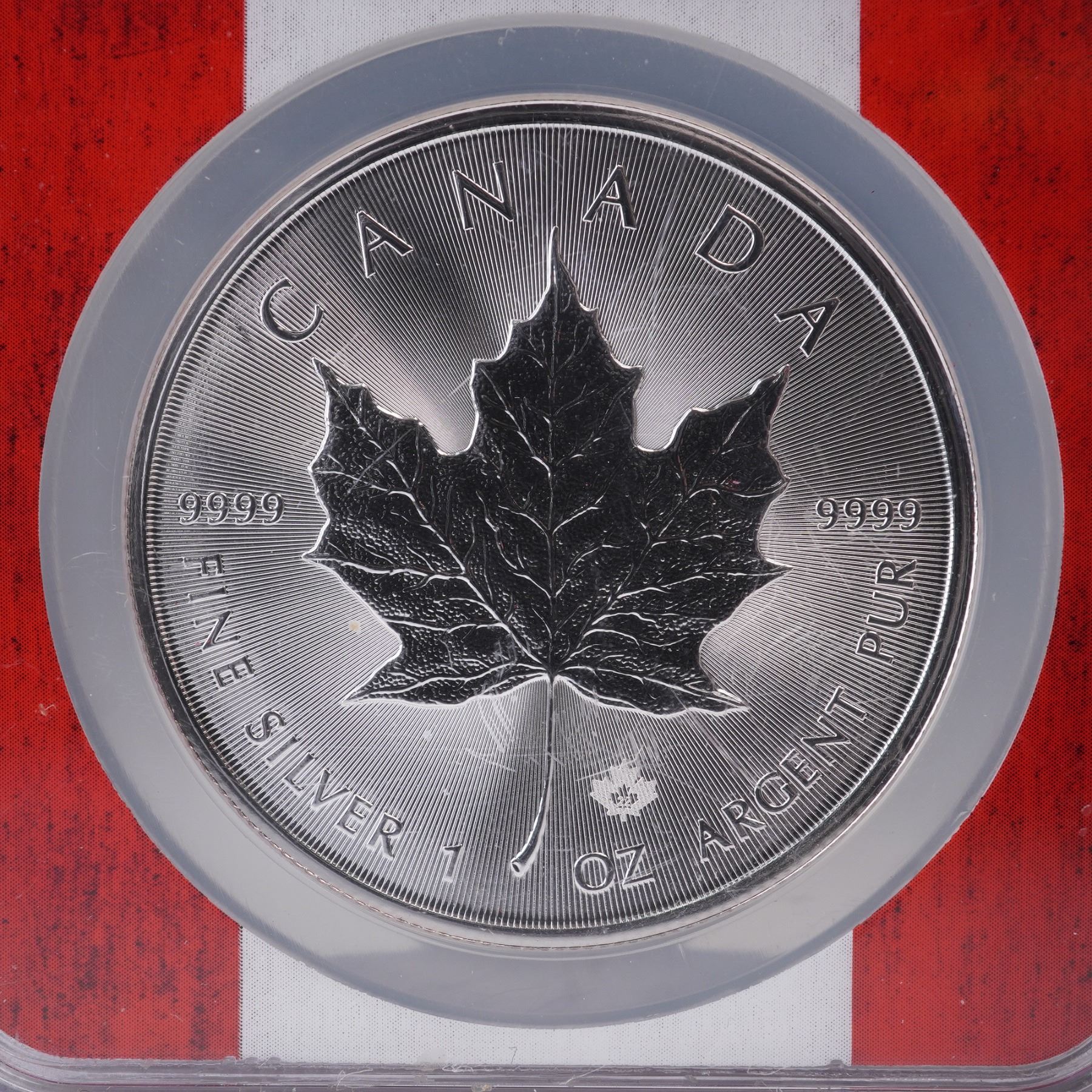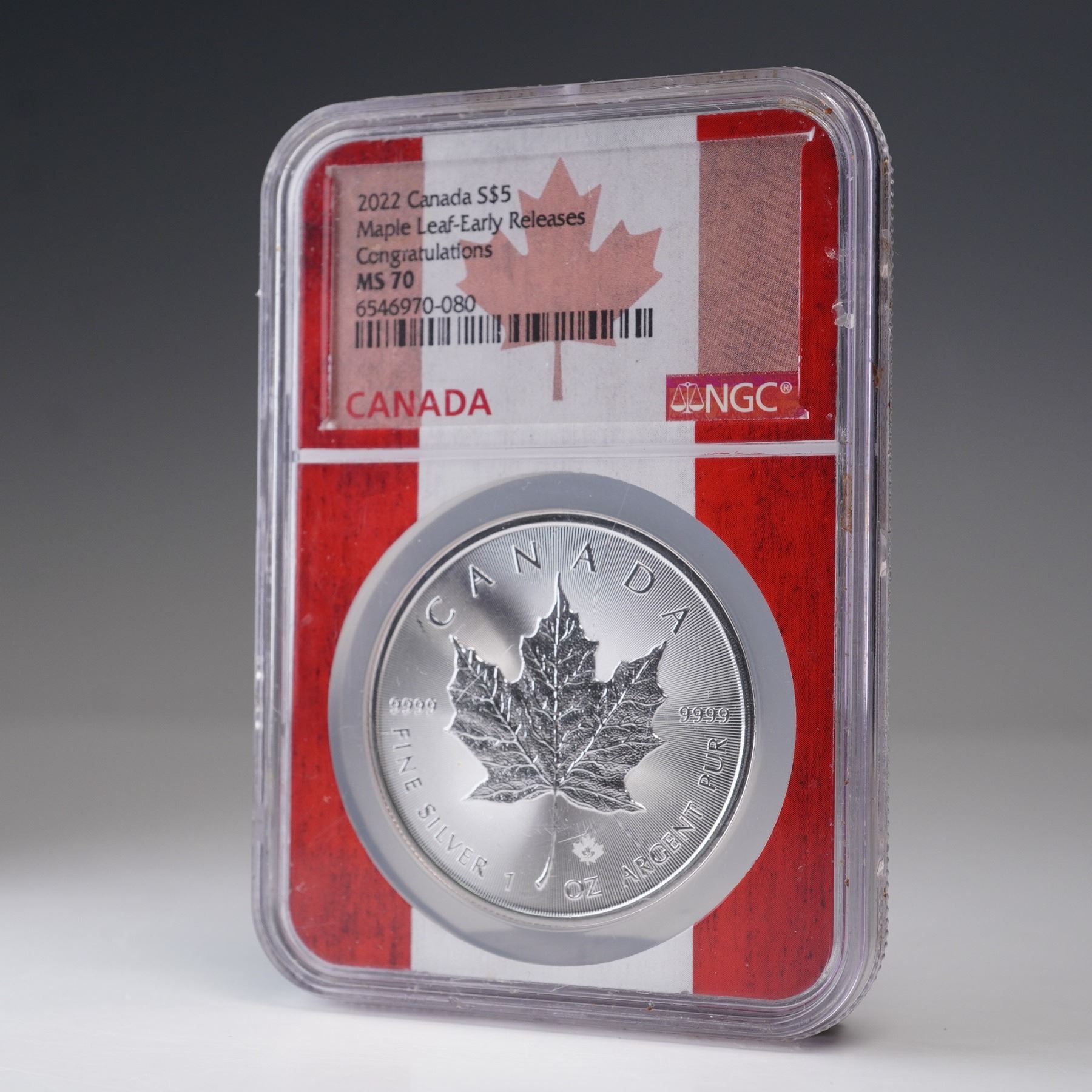 This 2022 Canadian Silver Maple Leaf coin, minted in one troy ounce of .9999 fine silver, is a special "Congratulations" issue certified by NGC as MS 70 in the Early Releases designation. The obverse carries the portrait of Queen Elizabeth II with a denomination of five dollars and the issue year. The reverse features the classic sugar maple leaf design surrounded by CANADA, 9999 on either size, and FINE SILVER 1 OZ ARGENT PUR. Housed in a graded NGC holder, boldly patriotic red and white Canadian design for further preservation and authentication. Slab measures: 2.25"L x 0.25"W x 3.25"H. Coin diameter: 38 mm.