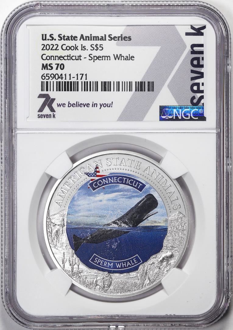 One 2022 Cook Islands $5 Connecticut Sperm Whale Silver Coin NGC MS70. NGC Certified.