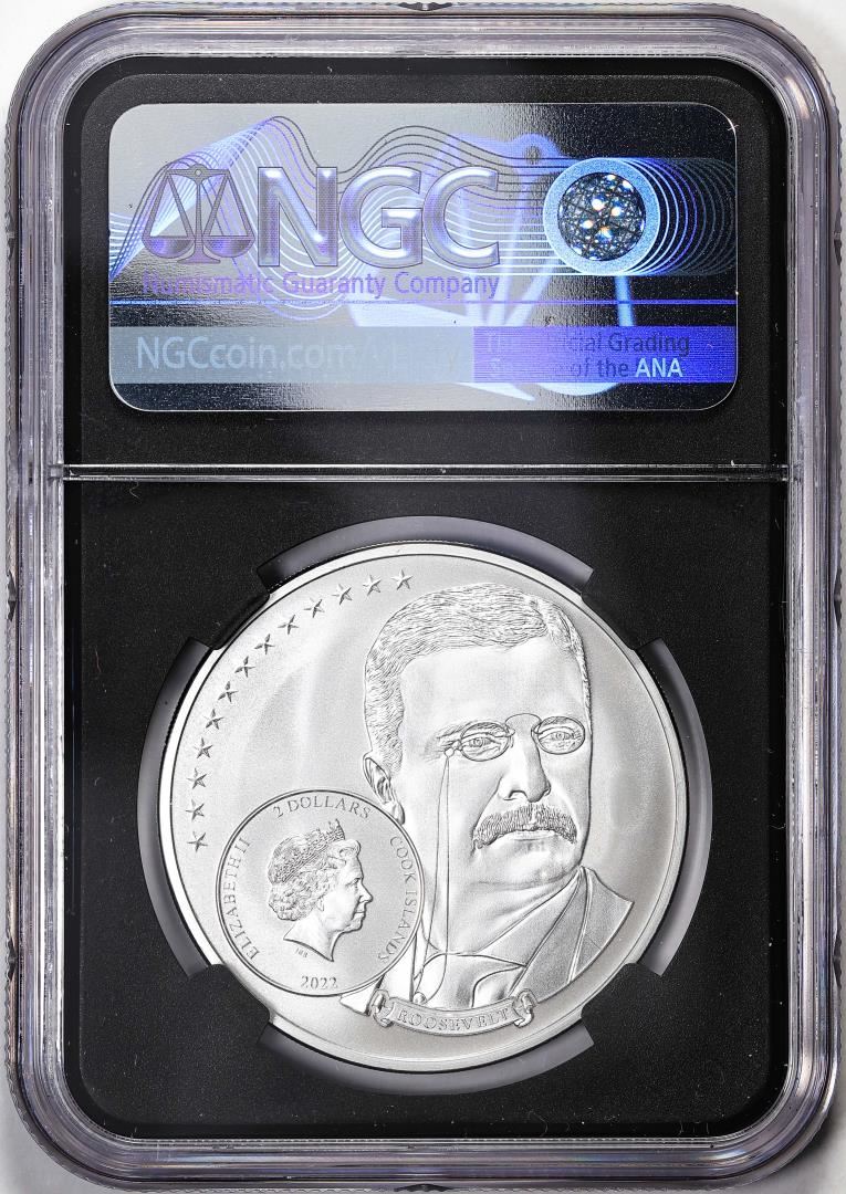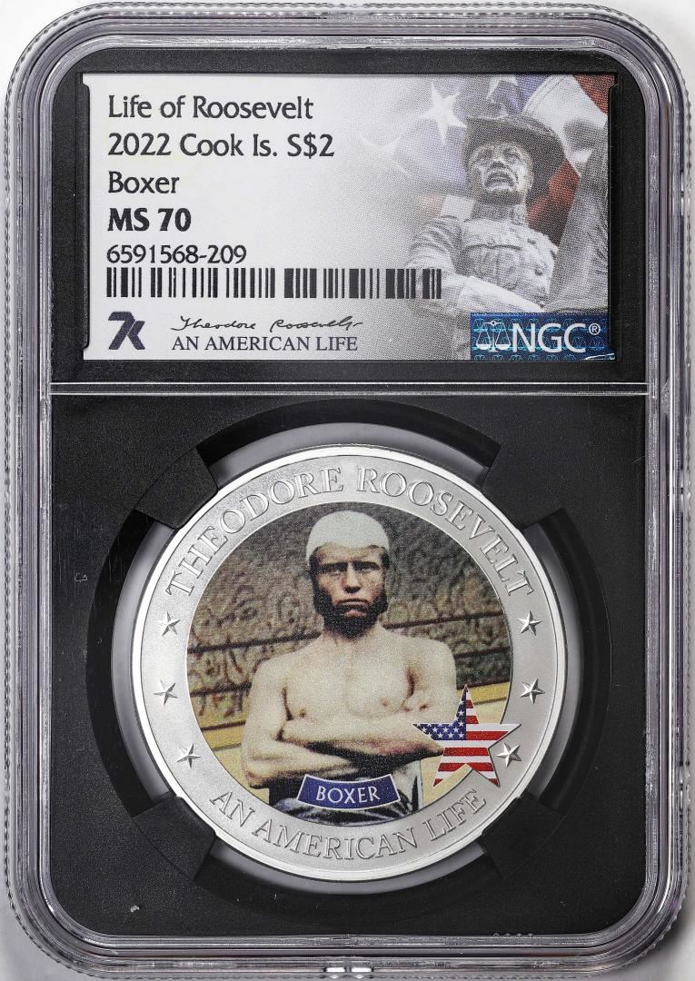 One 2022 Cook Islands $5 Life of Roosevelt Boxer Silver Coin NGC MS70. NGC Certified.