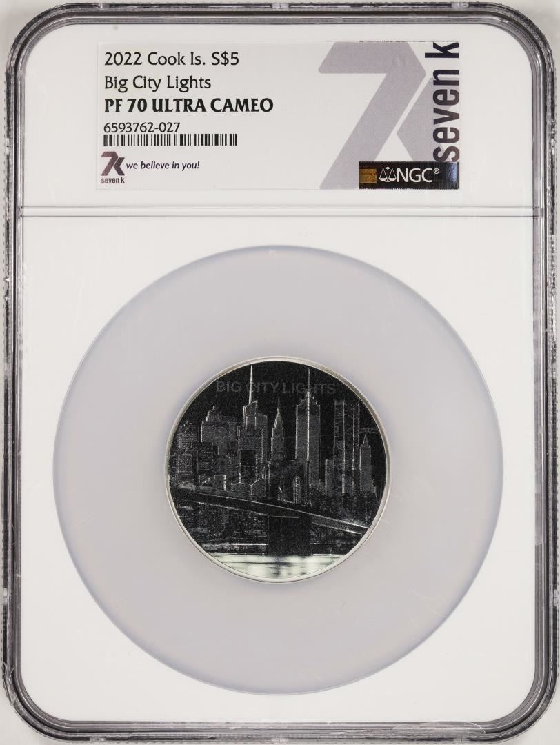 One 2022 Cook Islands $5 Proof Big City Lights Silver Coin NGC PF70 Ultra Cameo. NGC Certified.