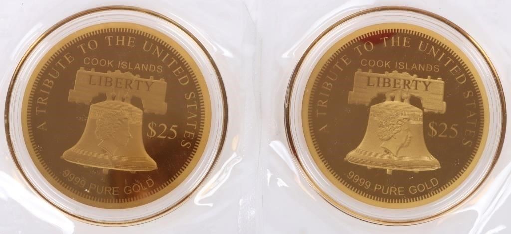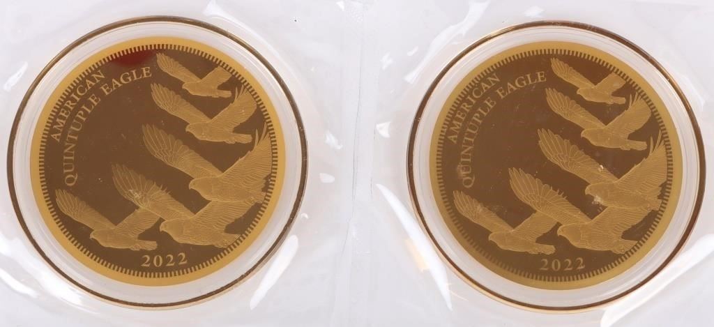 2022 fine gold American Quintuple $25 Eagles to include a protective casing for each 1200mg pure gold coin with the inscription "A Tribute To The United States Cook Islands" on the reverse side.