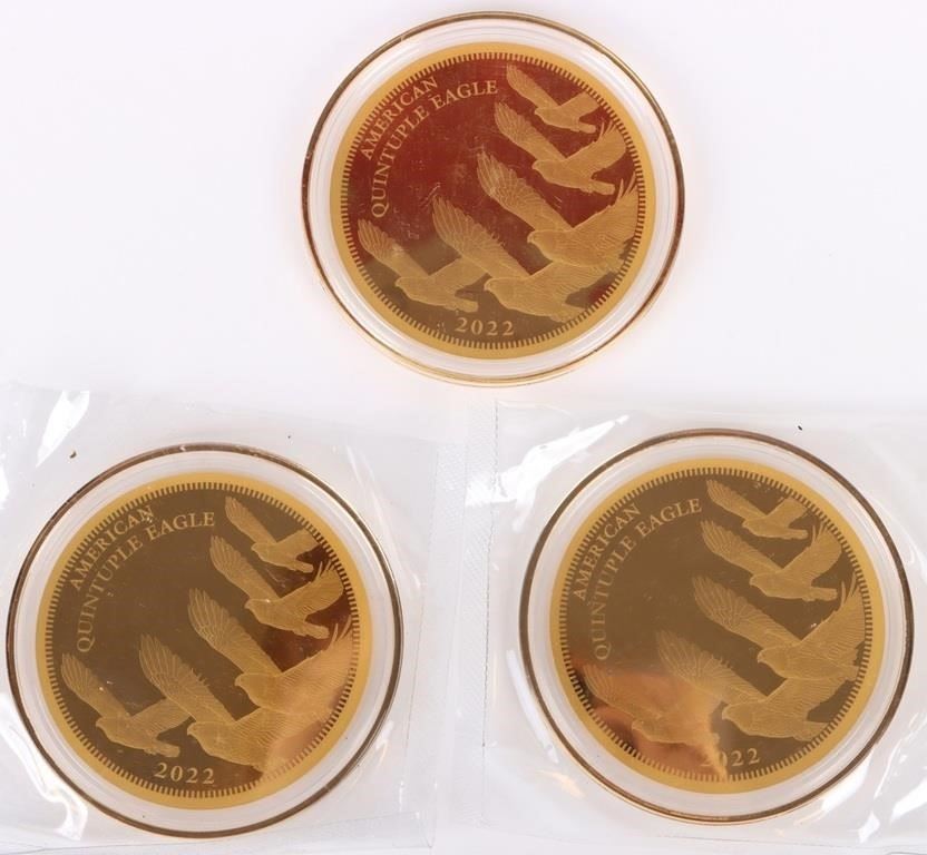2022 fine gold American Quintuple $25 Eagles to include a protective casing for each 1200mg pure gold coin along with the words & quot;A Tribute To The United States Cook Islands.& quot;