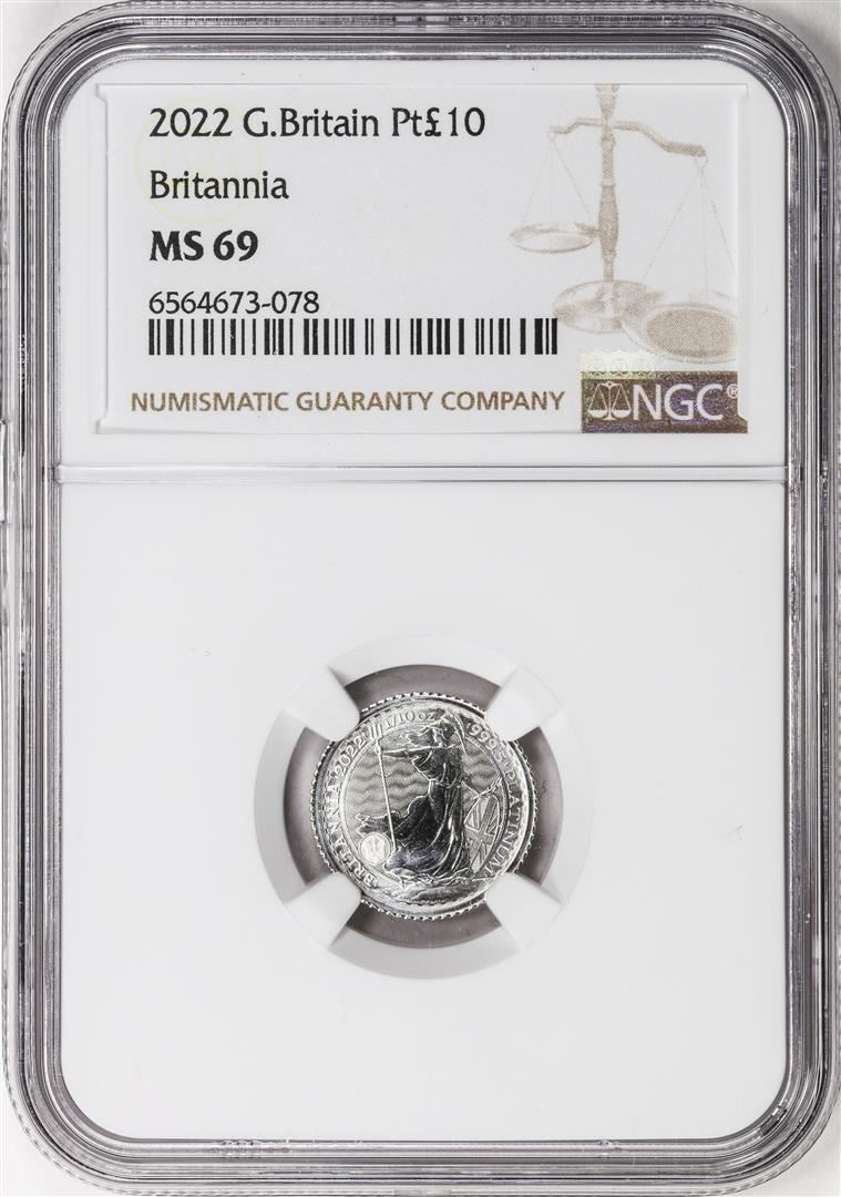 One 2022 Great Britain 10 Pounds Britannia 1/10oz Platinum Coin NGC MS69. NGC Certified.