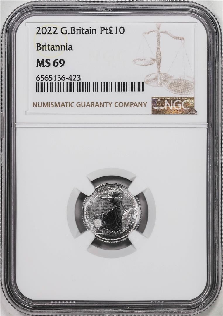 One 2022 Great Britain 10 Pounds Britannia 1/10oz Platinum Coin NGC MS69. NGC Certified.