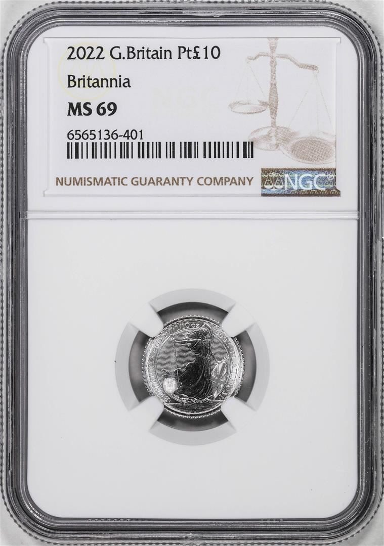 One 2022 Great Britain 10 Pounds Britannia 1/10oz Platinum Coin NGC MS69. NGC Certified.