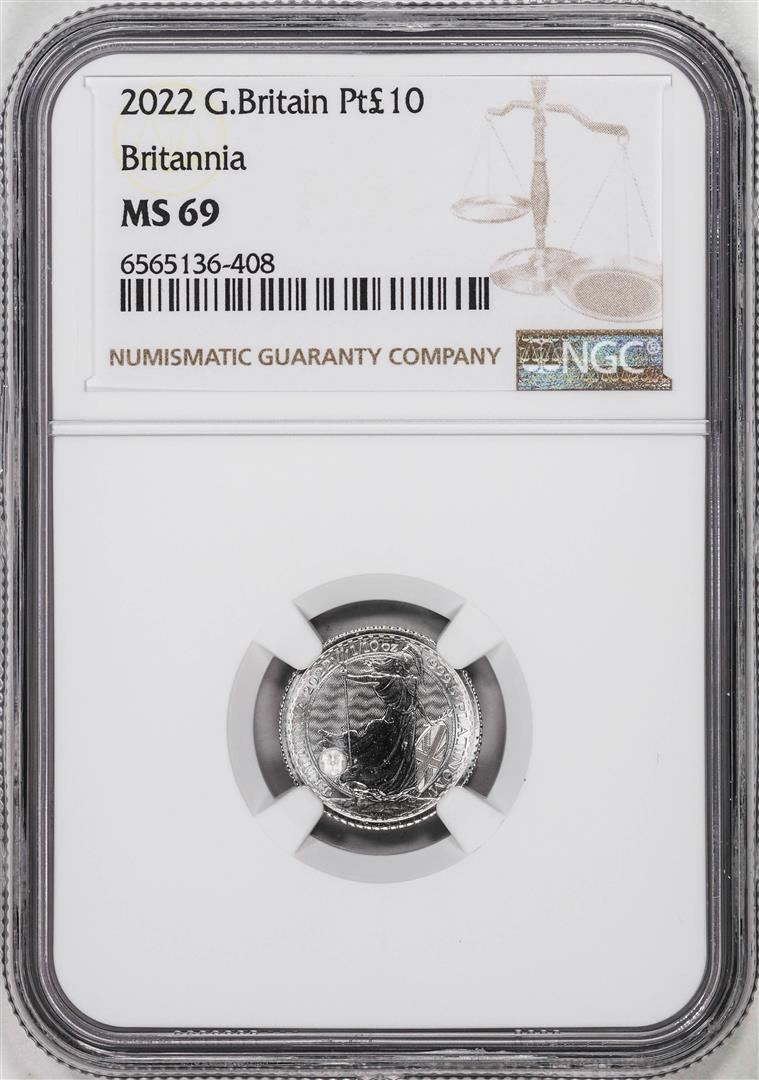 One 2022 Great Britain 10 Pounds Britannia 1/10oz Platinum Coin NGC MS69. NGC Certified.