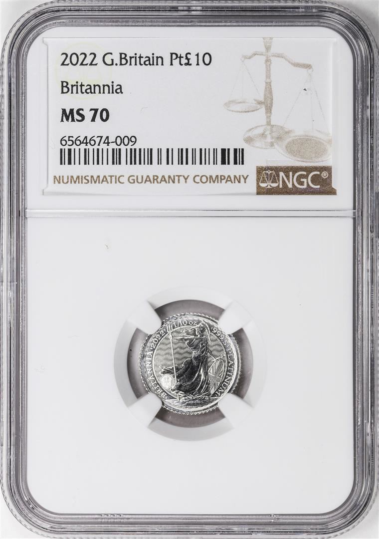 One 2022 Great Britain 10 Pounds Britannia 1/10oz Platinum Coin NGC MS70. NGC Certified.