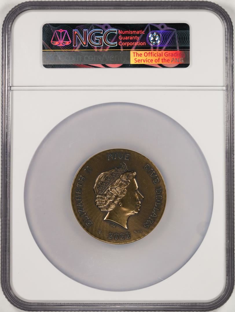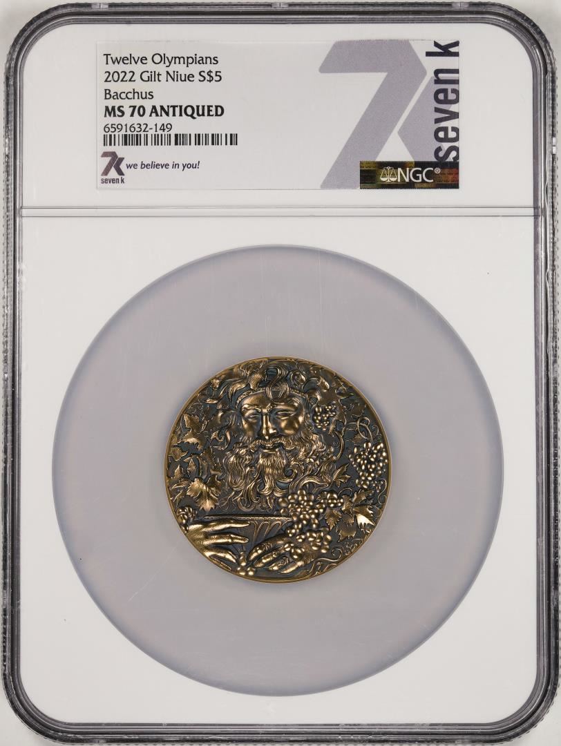 One 2022 Niue $5 Twelve Olympians Bacchus Silver Gilt Coin NGC MS70 Antiqued. NGC Certified.