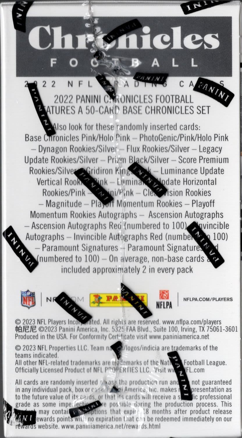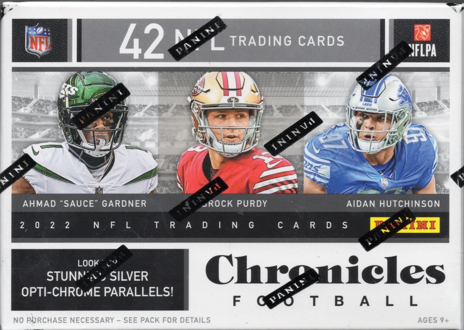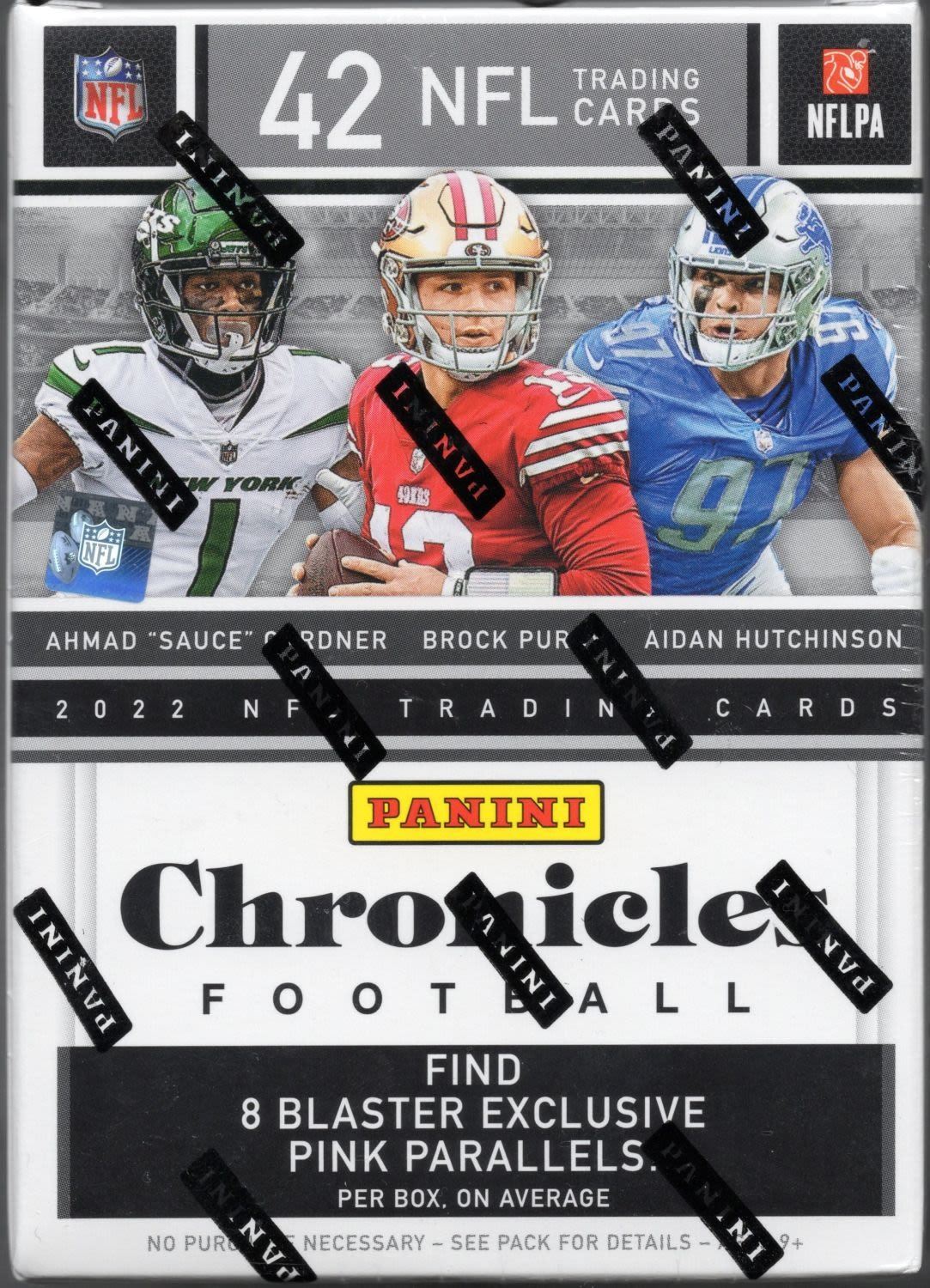 2022 Panini Chronicles Football 6-Pack Blaster Box (Pink Parallels!) Look for Silver Opti-Chrome Parallels! Purdy, Gardner, Hutchinson Rookies