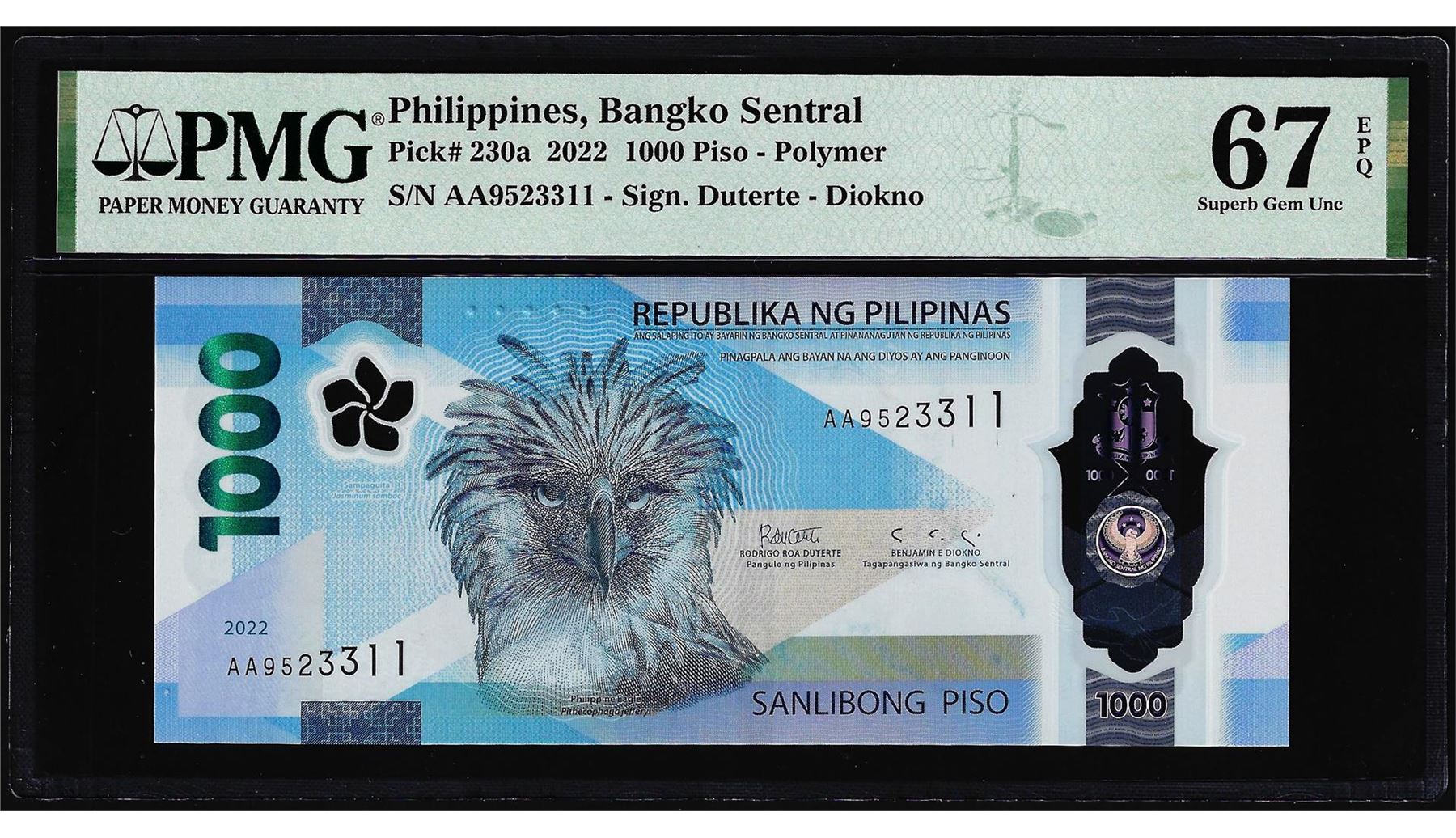 2022 Philippines Central Bank 1000 Piso Note P230a PMG Superb Gem Uncirculated 67EPQ