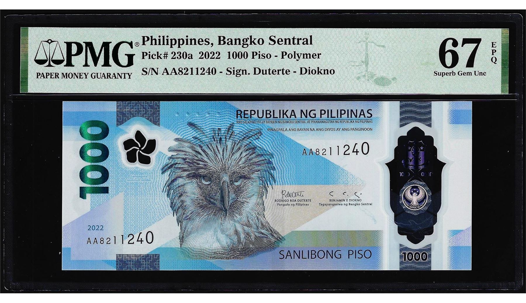 One 2022 Philippines Central Bank 1000 Piso Note P230a PMG Superb Gem Uncirculated 67EPQ. PMG Certified.