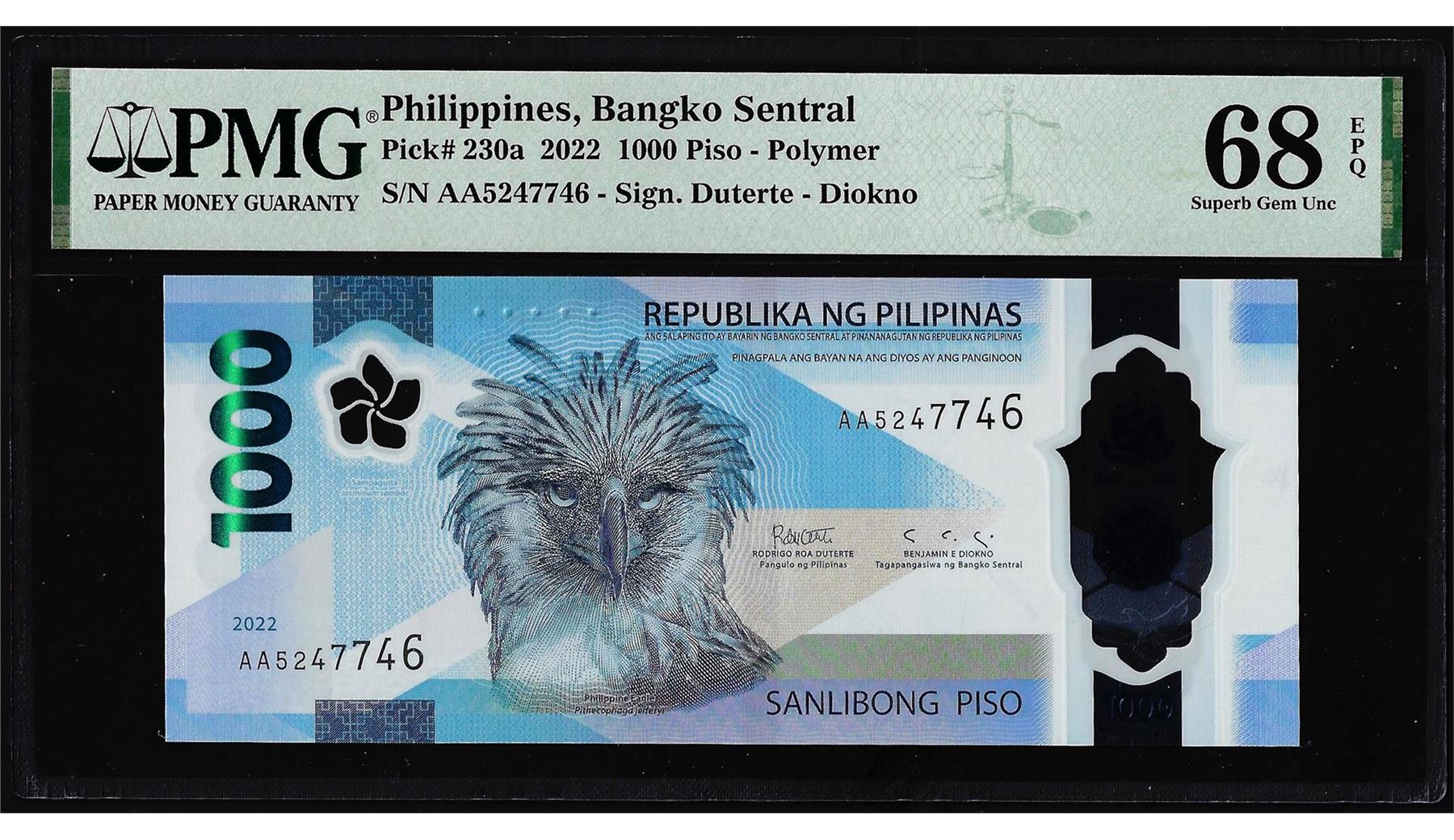 2022 Philippines Central Bank 1000 Piso Note P230a PMG Superb Gem Uncirculated 68EPQ