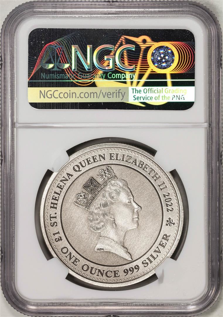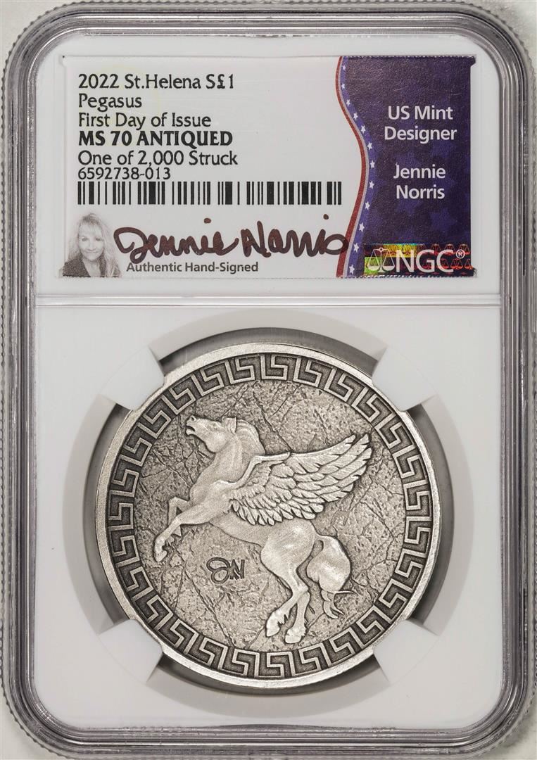One 2022 Pound St. Helena Silver Pegasus Coin NGC MS70 Antiqued FDOI Norris Signed. NGC Certified.