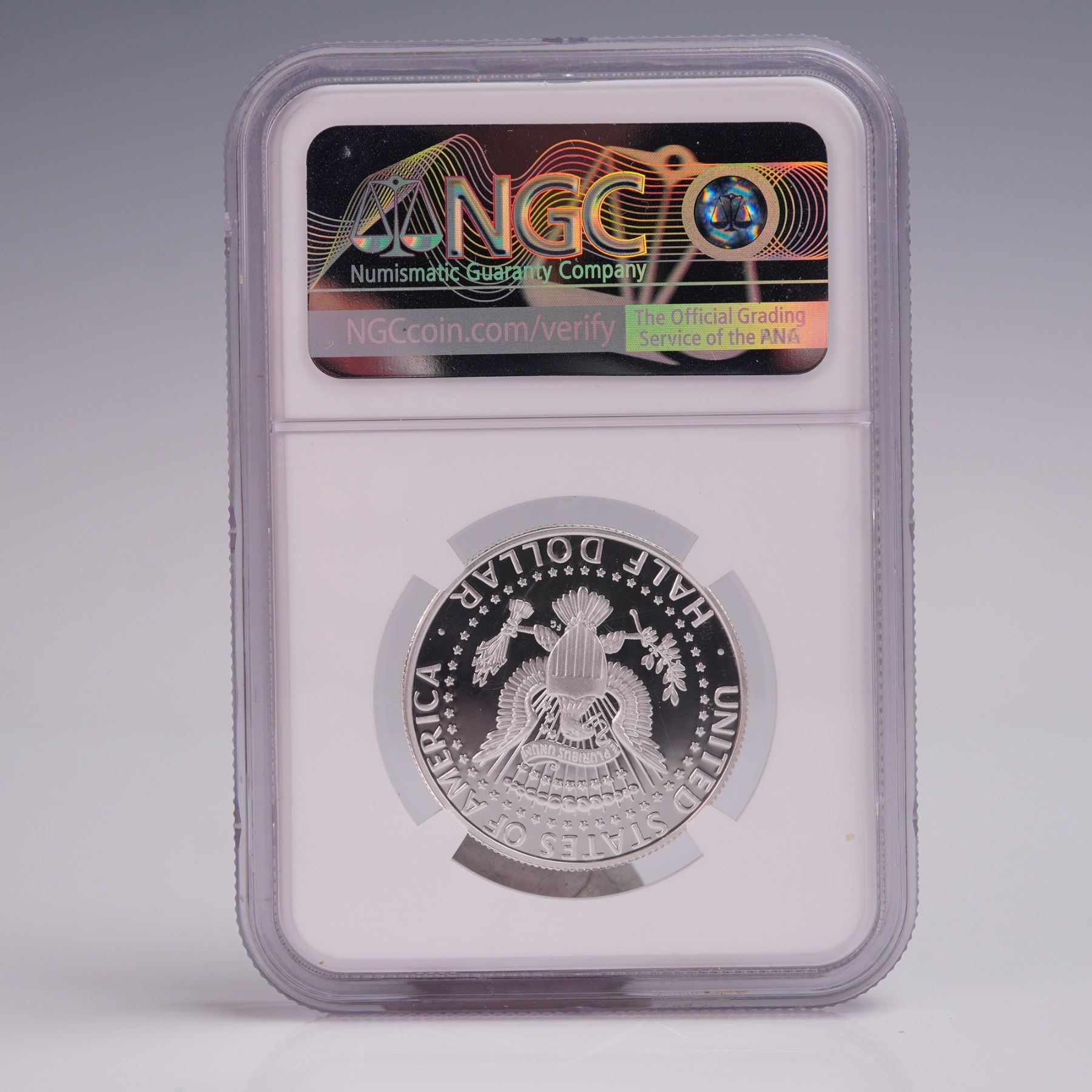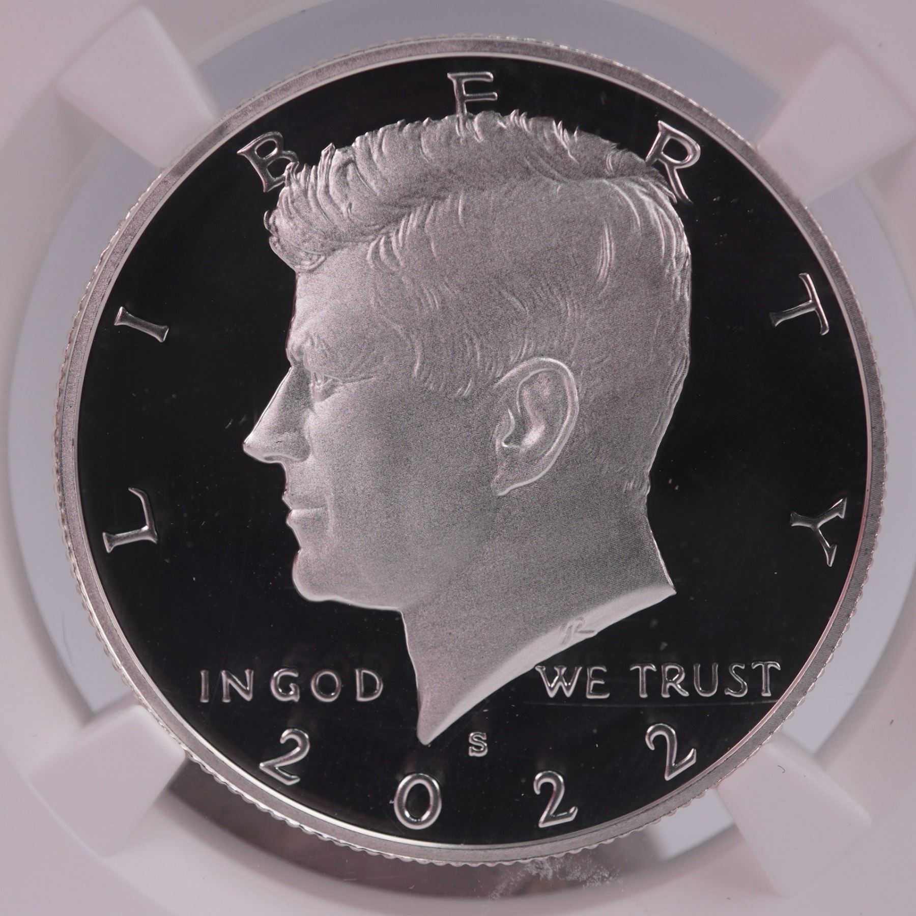 This pristine 2022-S Silver Kennedy Half Dollar was struck in .999 fine silver at the San Francisco Mint and certified PF 70 Ultra Cameo by NGC. Part of the 10-Coin Silver Proof Set released for the 2022 Chicago ANA Show, it is housed in an official holder with the American Numismatic Association label. The coin features flawless surfaces, deeply mirrored fields, and strong frosted contrast. The obverse presents a left-facing portrait of President John F. Kennedy, accompanied by the inscriptions LIBERTY, GR, IN GOD WE TRUST, S, and 2022. The design was created and engraved by Gilroy Roberts. On the reverse, a modified version of the presidential seal appears: a bald eagle with a striped shield, grasping an olive branch and thirteen arrows. In its beak is a scroll inscribed with the Latin motto E PLURIBUS UNUM, meaning "Out of Many, One." A ring of fifty stars encircles the design. Additional inscriptions include UNITED STATES OF AMERICA, E PLURIBUS UNUM, FG, and HALF DOLLAR. The reverse was designed and engraved by Frank Gasparro. This coin is encapsulated in a tamper-proof NGC slab.