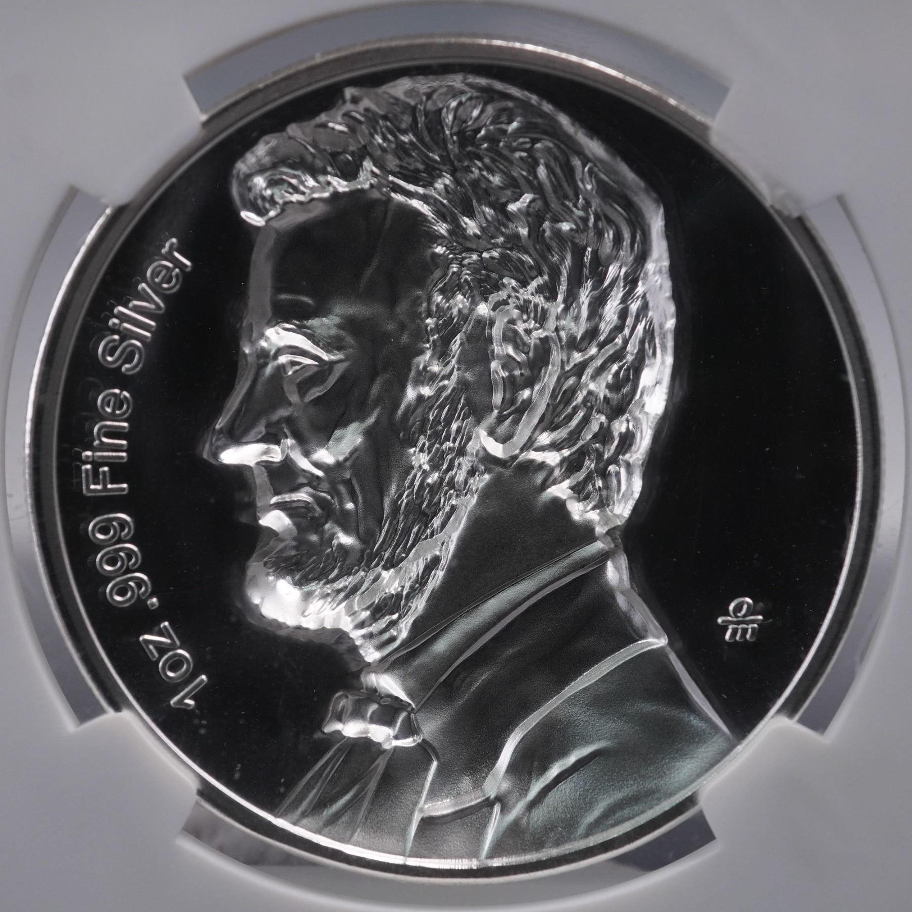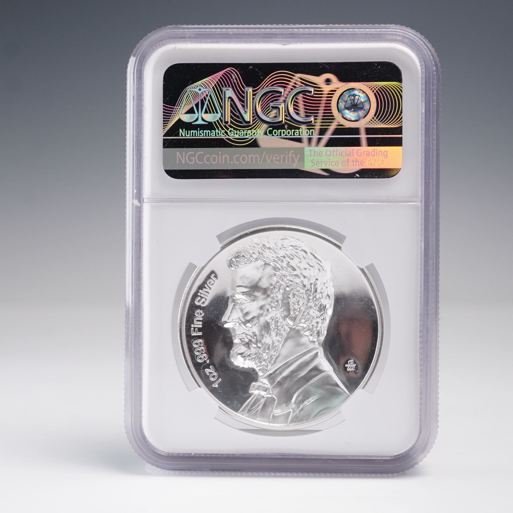 A 2022 American Legacy Collection silver medal rendered in high relief, featuring a masterfully sculpted tribute to the historic 1909-S Lincoln Cent. Struck in one troy ounce of .999 fine silver, this commemorative issue replicates the iconic profile of Abraham Lincoln, originally designed by Victor David Brenner, with remarkable depth and precision. Graded PF 69 Ultra Cameo by NGC. The reverse side also bears a bold mirrored relief with the silver weight and fineness marked. Housed in a protective slab for preservation and authentication. Slab measures: 2.25"L x 0.25"W x 3.25"H. Coin diameter: 19.05 mm.