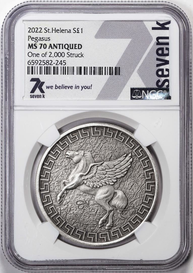 One 2022 St. Helena 1 Pound Pegasus Silver Coin NGC MS70 Antiqued. NGC Certified.