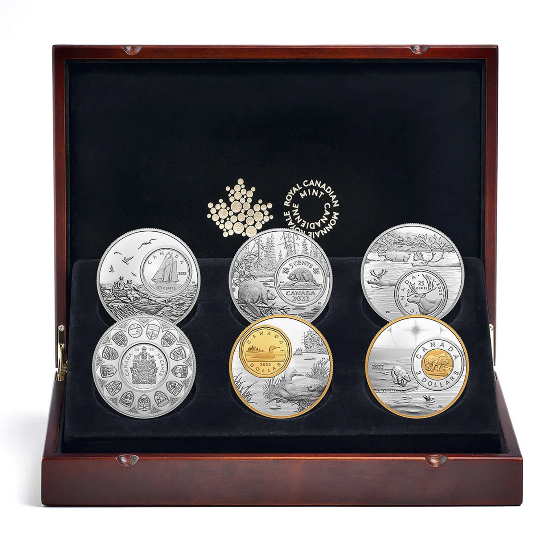 Each coin is 5oz and .9999 fine silver with a special design to go with the coin that they represent. The coins representing $1 & $2 both have selective gold plating. Coins have some natural toning. (Tax Exempt)