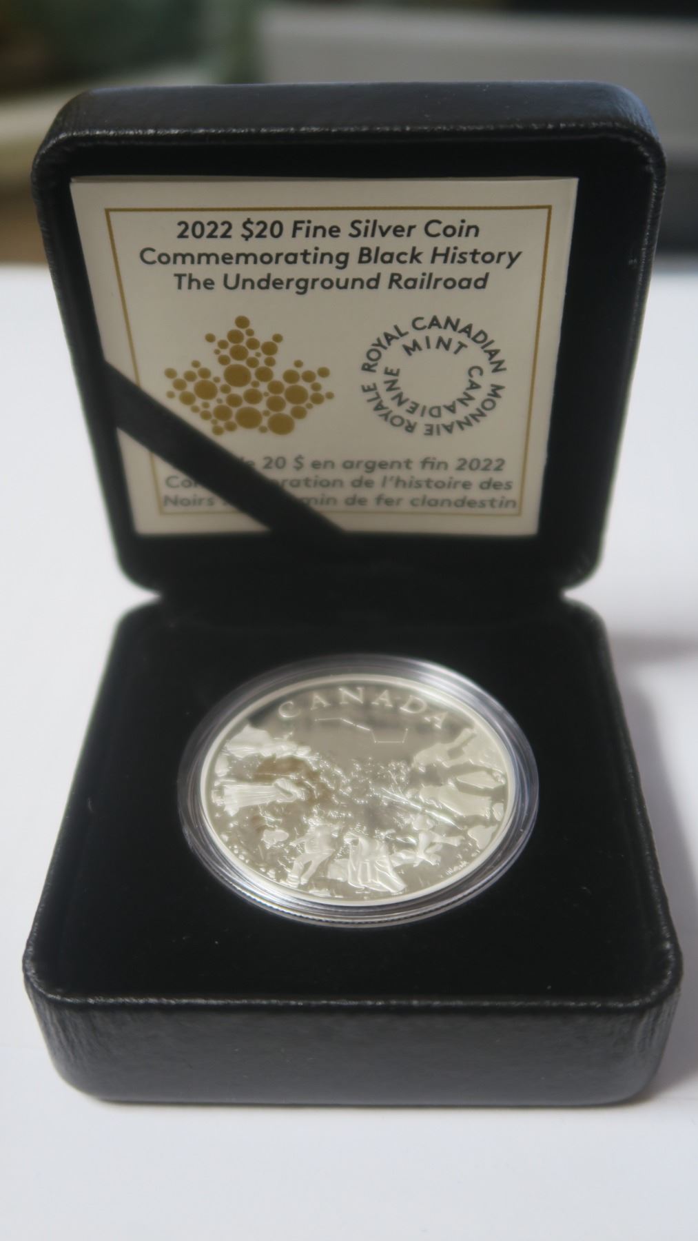 2022 The Underground Railroad $20. Celebrates Canadian Black History. 99.99% pure Silver. Proof with Ultra Heavy Cameo. Housed in its original case & box of issue.