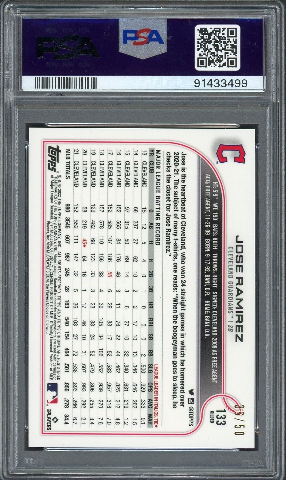 2022 Topps Gilded Mini Diamond Gold etch #'d to 50 of star Cleveland Guardians 3rd baseman Jose Ramirez graded a gem mint 10 by PSA!