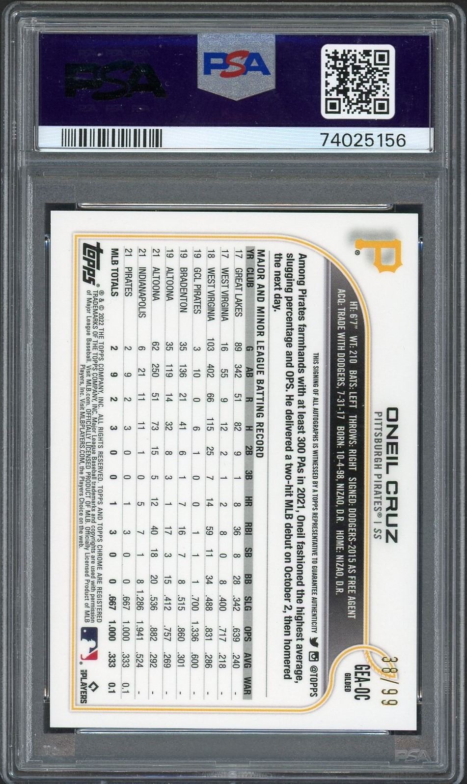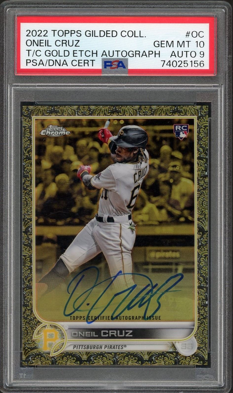 2022 Topps Gilded Collection Gold etch rookie autograph of Pirates star Oneil Cruz #'d to 99 graded a gem mint 10 by PSA!