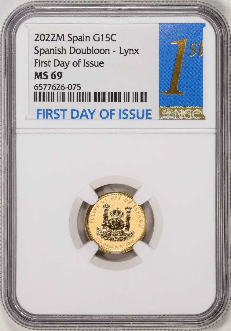 One 2022M Spain 15 Euro Cent Lynx Gold Doubloon Coin NGC MS69 FDOI. NGC Certified.
