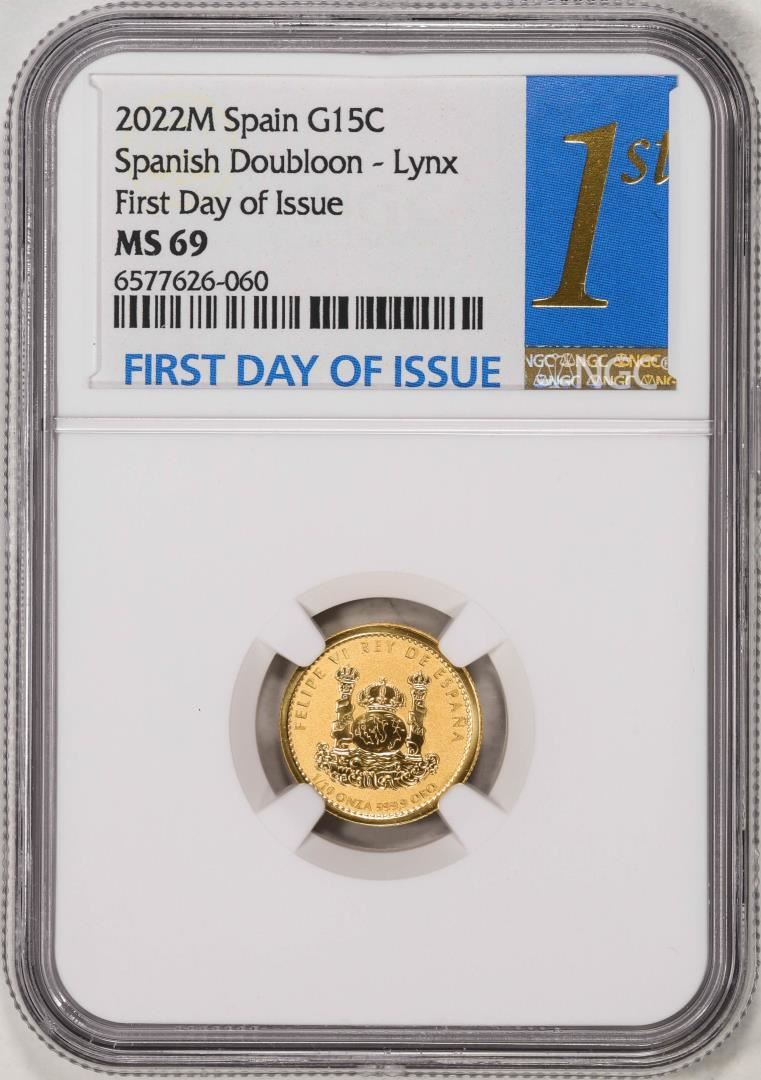 One 2022M Spain 15 Euro Cent Lynx Gold Doubloon Coin NGC MS69 FDOI. NGC Certified.