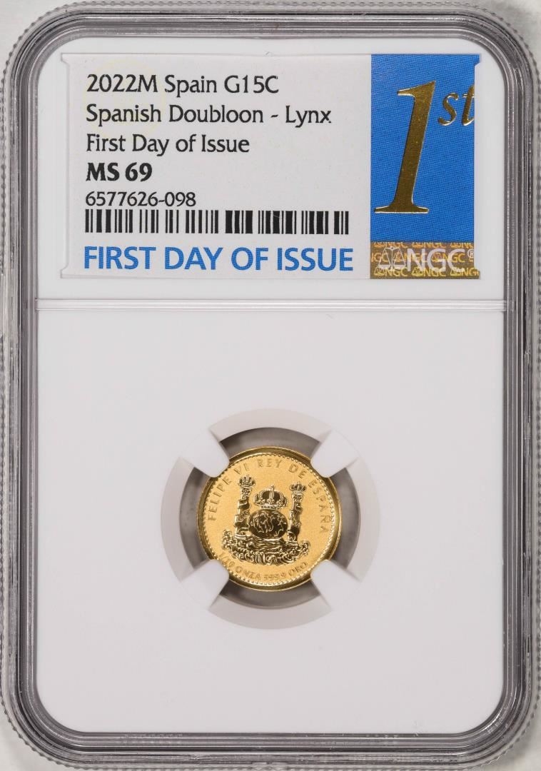 One 2022M Spain 15 Euro Cent Lynx Gold Doubloon Coin NGC MS69 FDOI. NGC Certified.