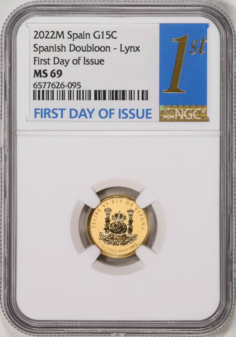 One 2022M Spain 15 Euro Cent Lynx Gold Doubloon Coin NGC MS69 FDOI. NGC Certified.