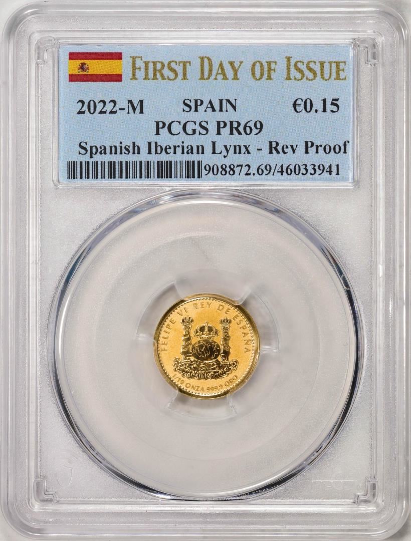 2022M Spain 15 Euro Cent Reverse Proof Lynx Gold Doubloon Coins PCGS PR69 FDOI
