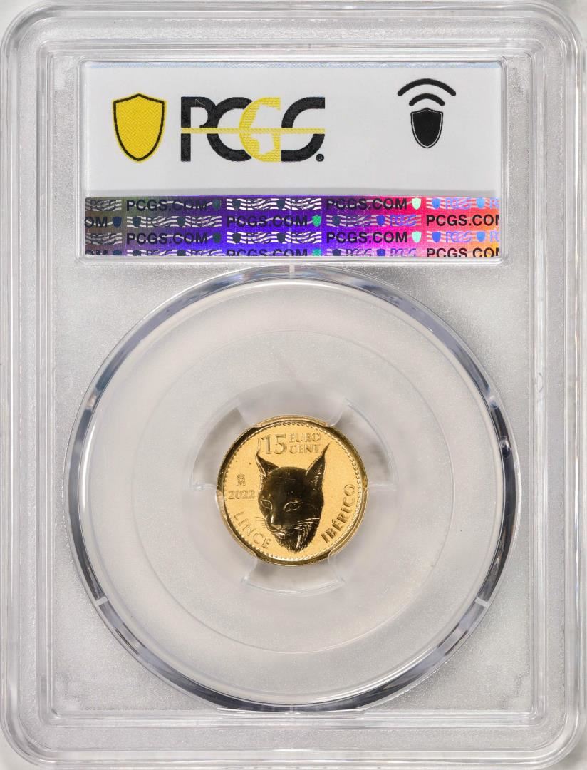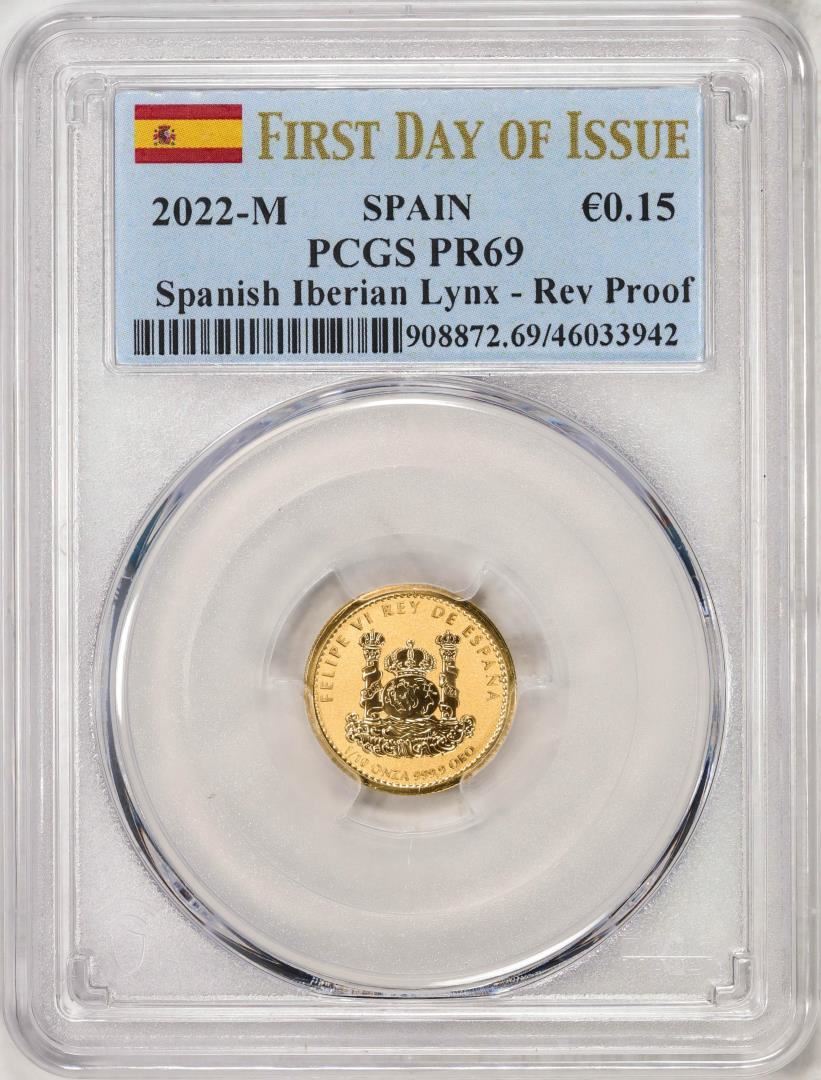 One 2022M Spain 15 Euro Cent Reverse Proof Lynx Gold Doubloon Coins PCGS PR69 FDOI. PCGS Graded.