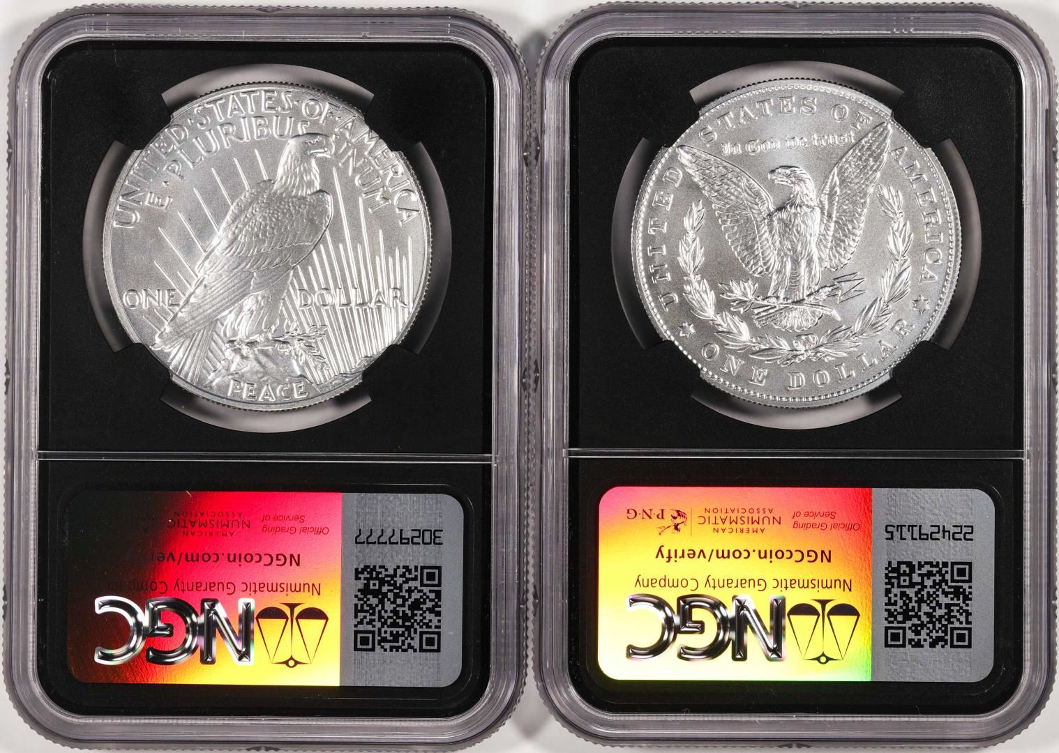 One 2023 $1 Morgan & Peace Silver Dollar Set NGC MS70 Advanced Releases Moy Signnature. NGC Certified.