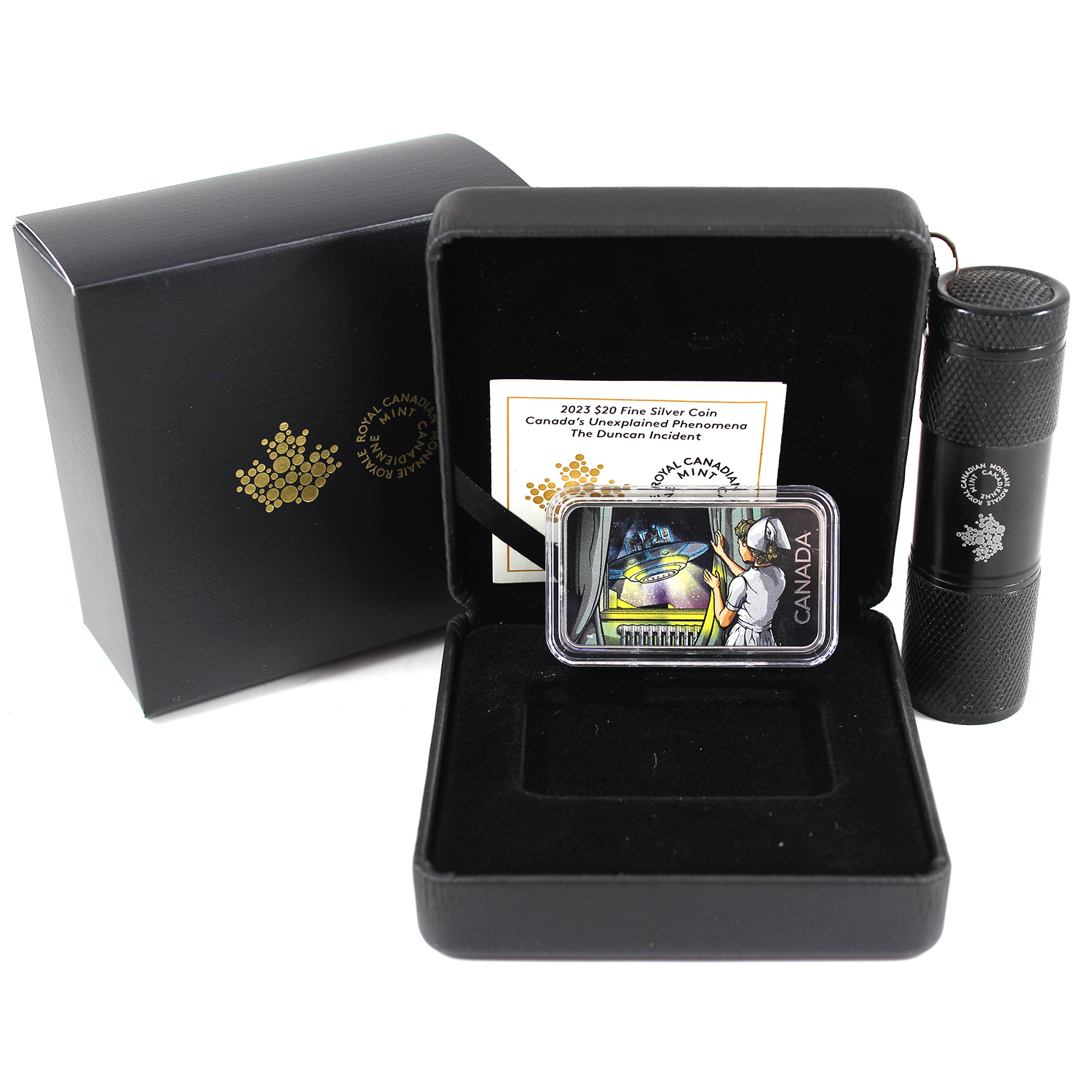 This coin is 1oz and .9999 fine with selective colour and special blacklight paint. The image on the reverse shows the famous Duncan Incident from the 1970's. The obverse features a fun wormhole design. Coin comes with RCM blacklight flashlight to illuminate the UFO on the coin. (Tax Exempt)