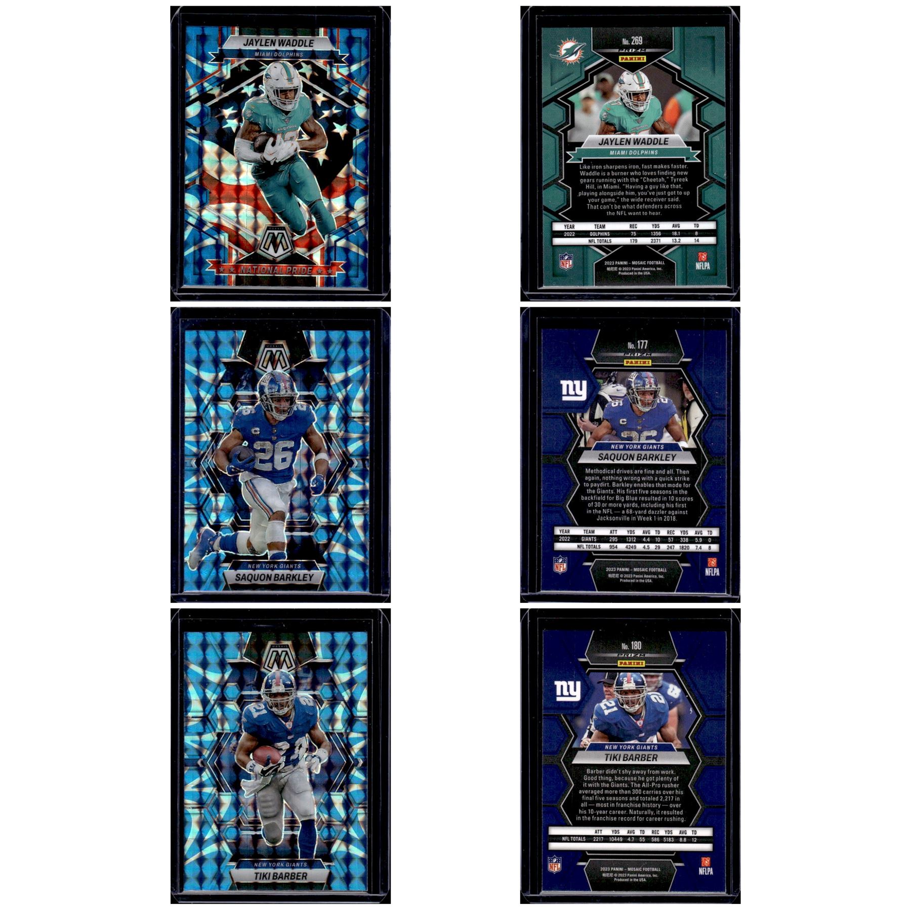 2023-'24 Panini Mosaic Blue Reactive Cards: Jaylen Waddle RC, Saquon Barkley, & Tiki Barber.