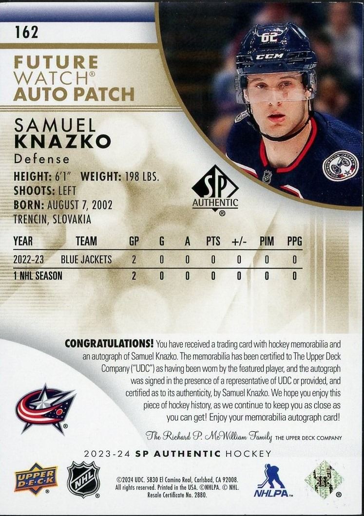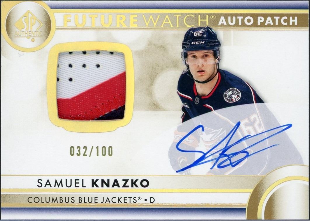 2023-24 UD SP Authentic future watch auto patch #'d to 100 of Blue Jackets rookie Samuel Knazko