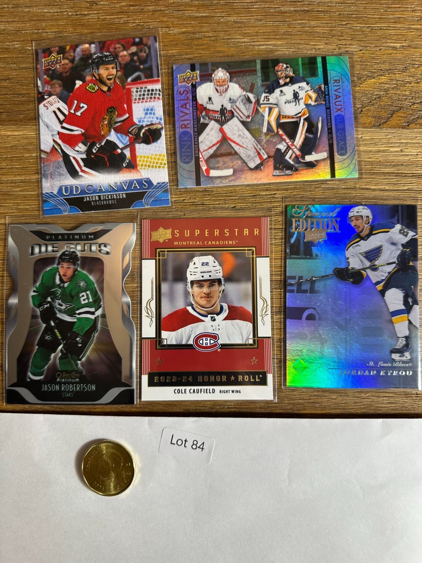 Assorted premium inserts including UD Canvas Jason Dickinson, Tim Hortons Rink Rivals Desbiens vs Maschmeyer, O-Pee-Chee Platinum Die-Cuts Jason Robertson, Upper Deck Honor Roll Superstar Cole Caufield, and Special Edition Silver Jordan Kyrou. Excellent to mint condition; strong collector mix. - Hockey Card