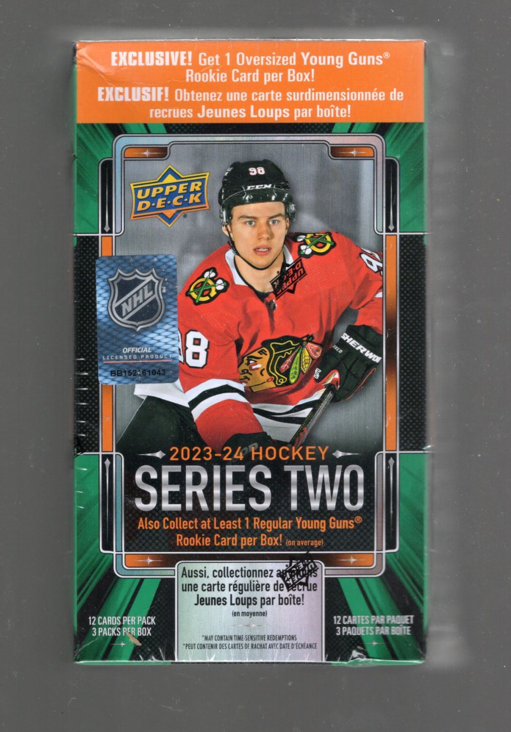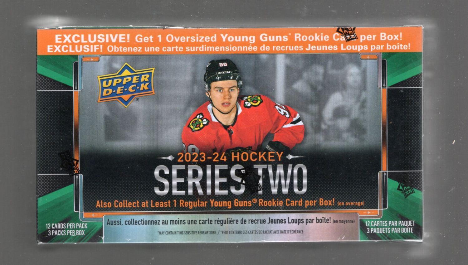 2023-24 Upper Deck Series 2 Hockey Blaster Box: Connor Bedard ROOKIE CARD!! GET 1 EXCLUSIVE OVERSIZED YOUNG GUN PER BOX!! Also, Collect at least 1 regular Young Guns Rookie card per box!! 12 Cards per pack & 3 packs per box!