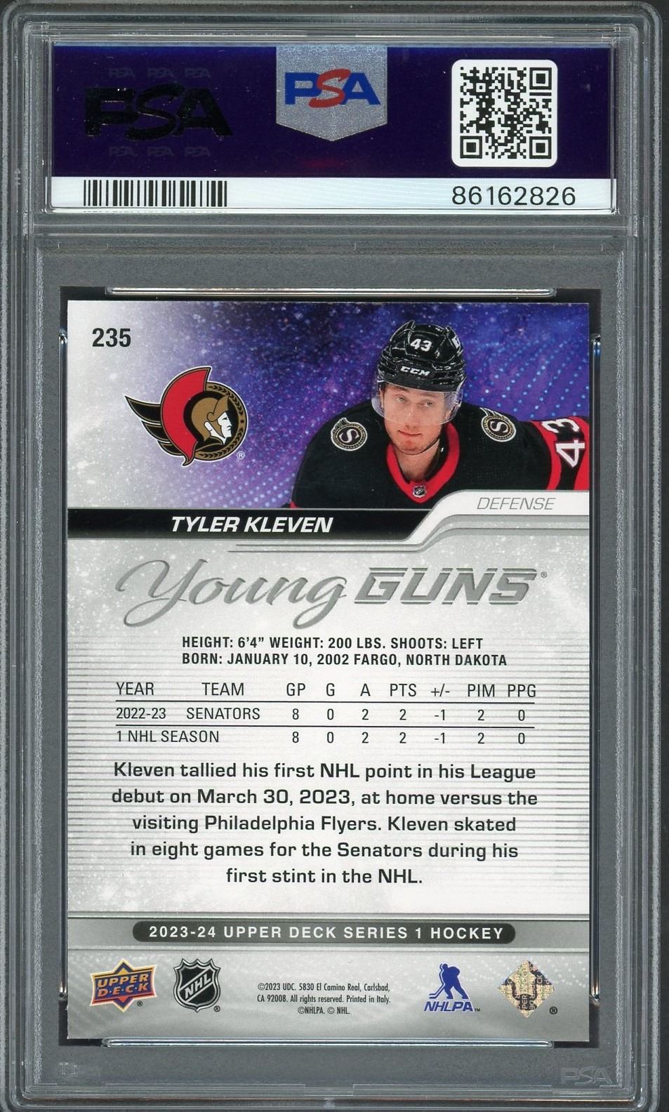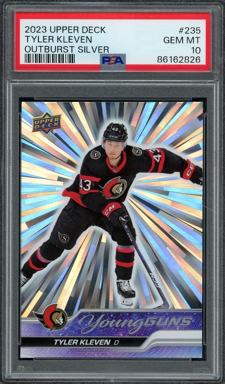 2023-24 UD Young Guns Silver outburst of Senators rookie Tyler Kleven graded a gem mint 10 by PSA!
