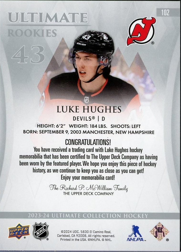 2023-24 UD Ultimate Rookies patch #'d to 349 of Devils star Dman Luke Hughes!