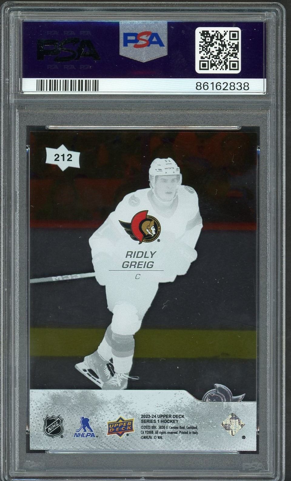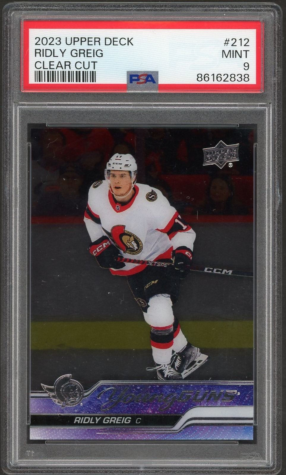 2023-24 UD Young Guns Clear Cut SP of Ottawa Senators forward Ridly Grieg graded a mint 9 by PSA!