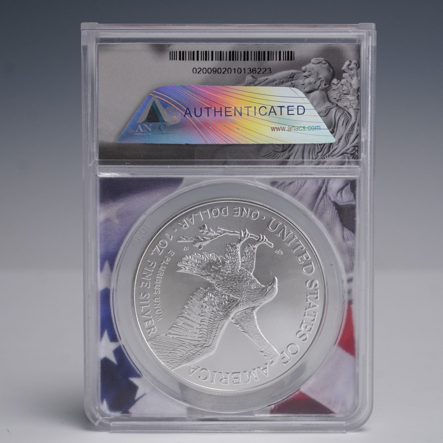 2023 American Silver Eagle, certified by ANACS as MS70 and designated as a First Strike coin. This one dollar silver coin contains 1 oz of .999 fine silver and features the iconic Walking Liberty design by Adolph A. Weinman on the obverse and the heraldic eagle with shield on the reverse. Encapsulated in a tamper-evident ANACS holder with authentication details. Case measures 2.5"L x 3.25"H.