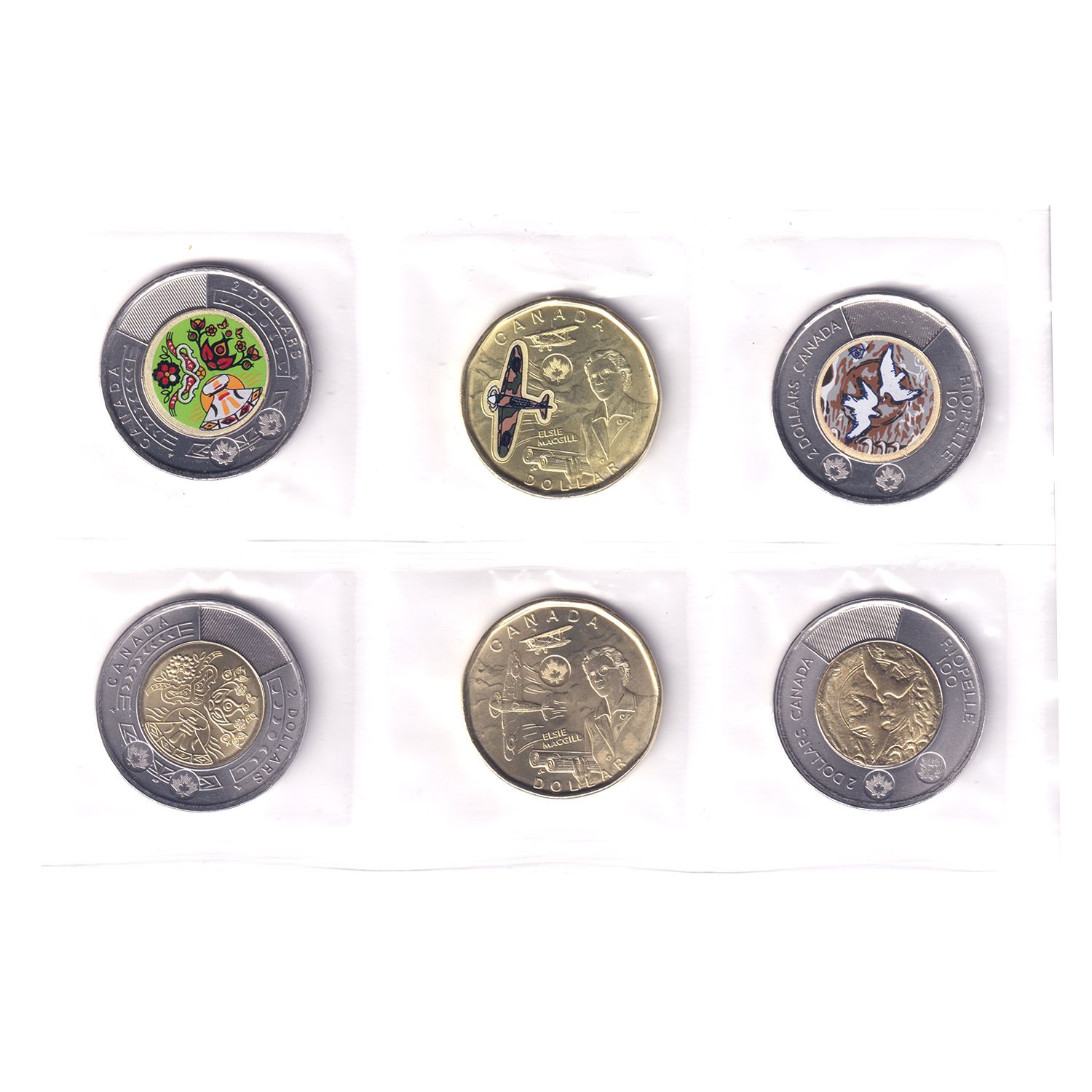 On the inside of the front cover is a Special Edition Uncirculated Set that is a book exclusive! Enclosed in a mylar coin flip, the seven coins represent the year’s biggest commemorations: 2x $2 National Indigenous Peoples Day coins (colourized and non-colourized); 2x $2 100th Anniversary of the Birth of Jean Paul Riopelle coins (colourized and non-colourized) and 2x $1 Honouring Elsie MacGill (colourized and non-colourized). Also includes colour poster. Book cover has scratch.