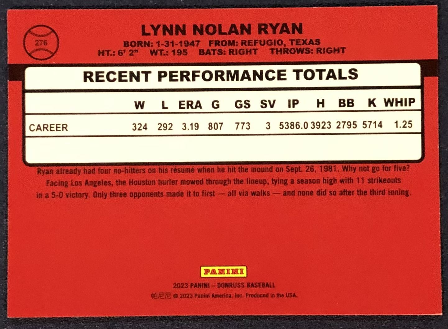Card #276 (reverse image, Ryan piching left handed) MLB, baseball, hall of fame