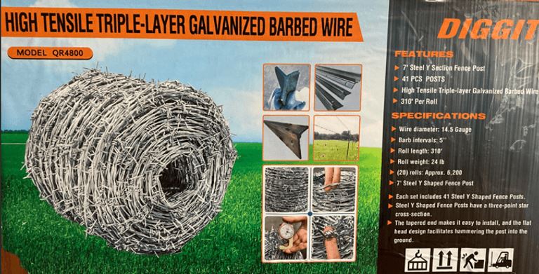 Includes 41-7' steel wide section fence posts, 20 rolls of barbed wire, approx. 310' per roll, 14.5 gauge, model QR4800