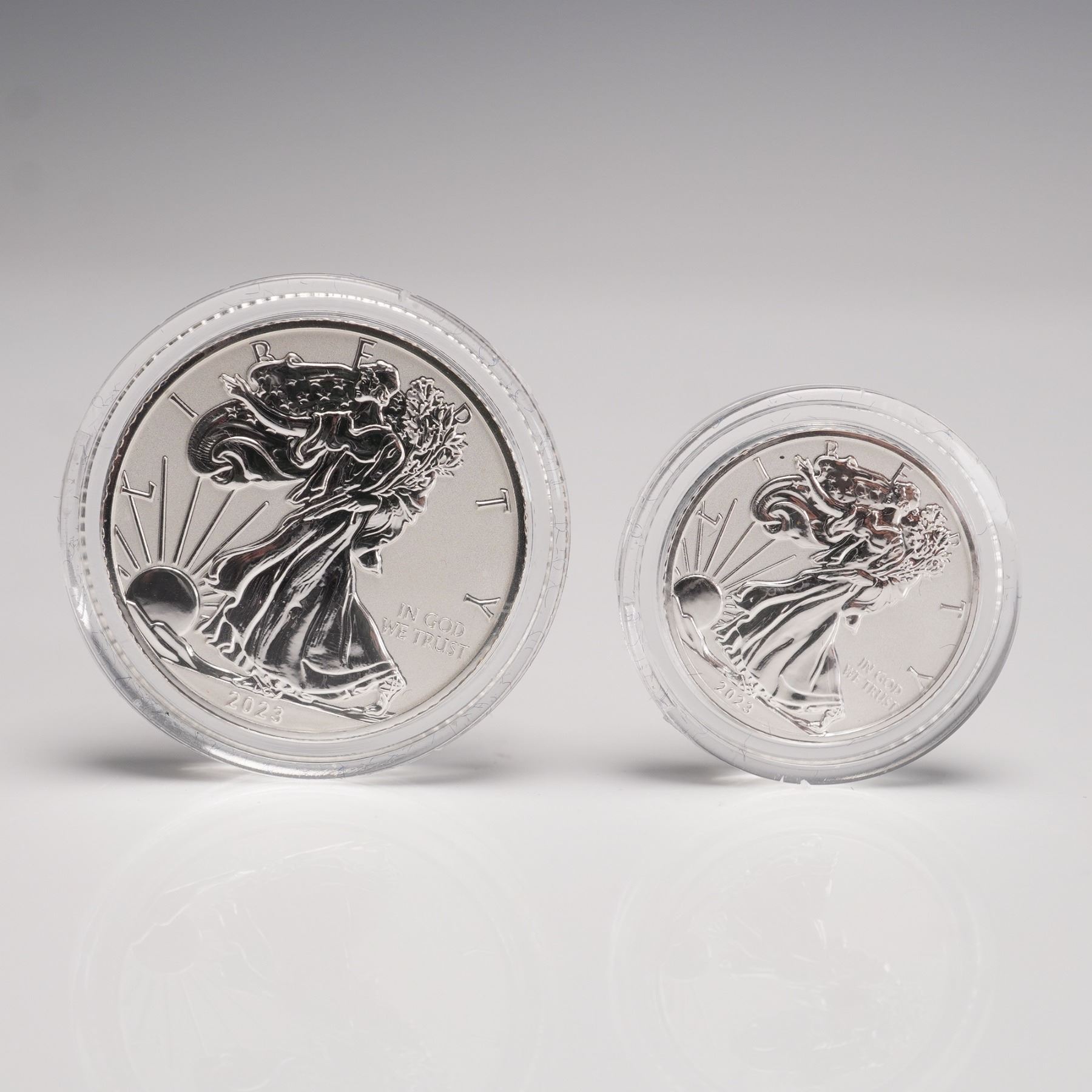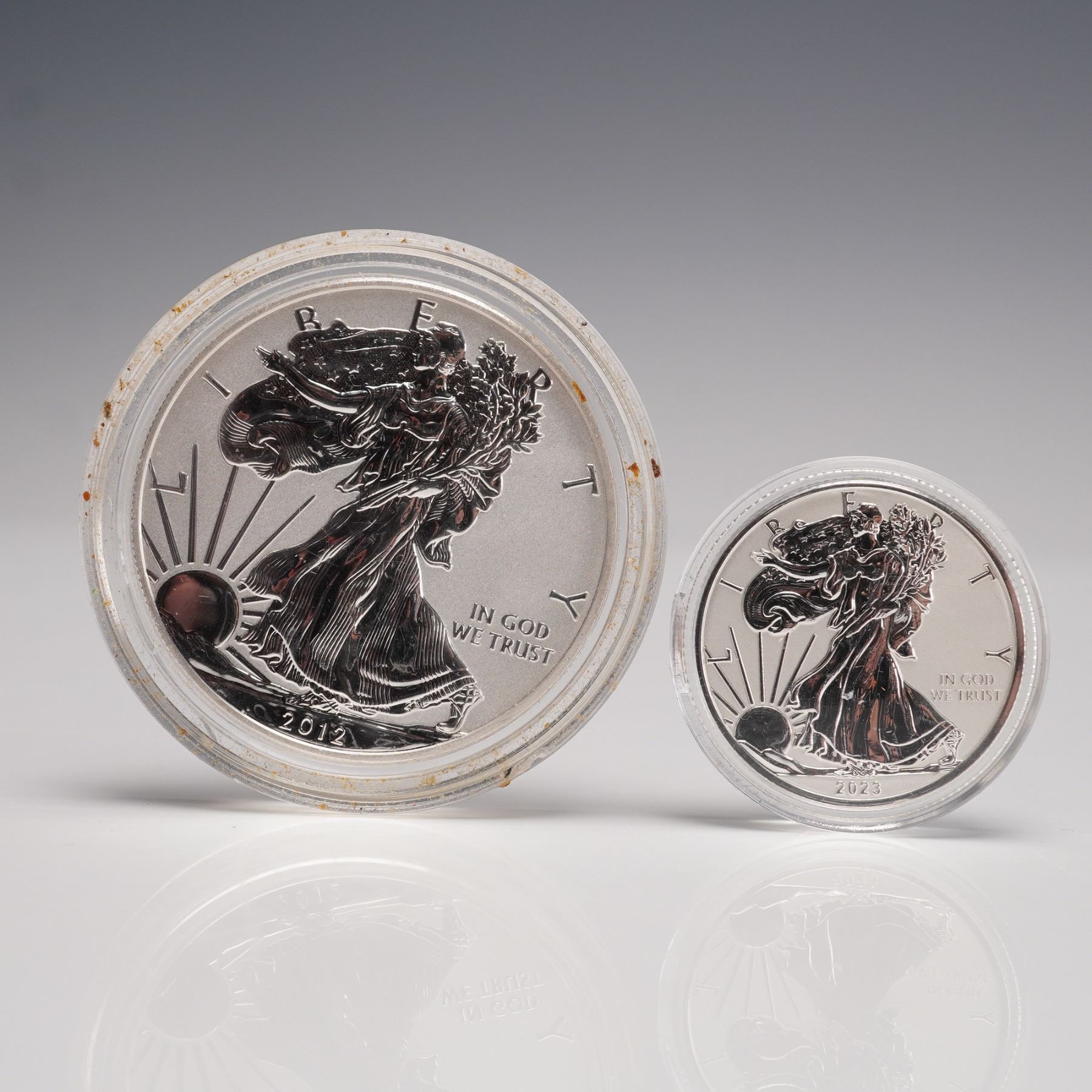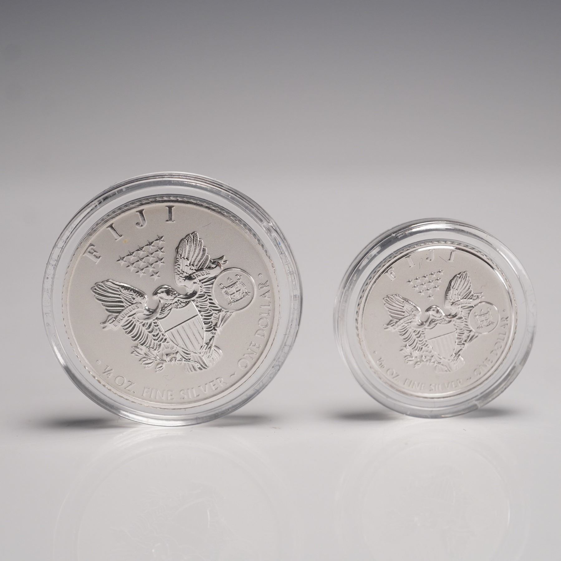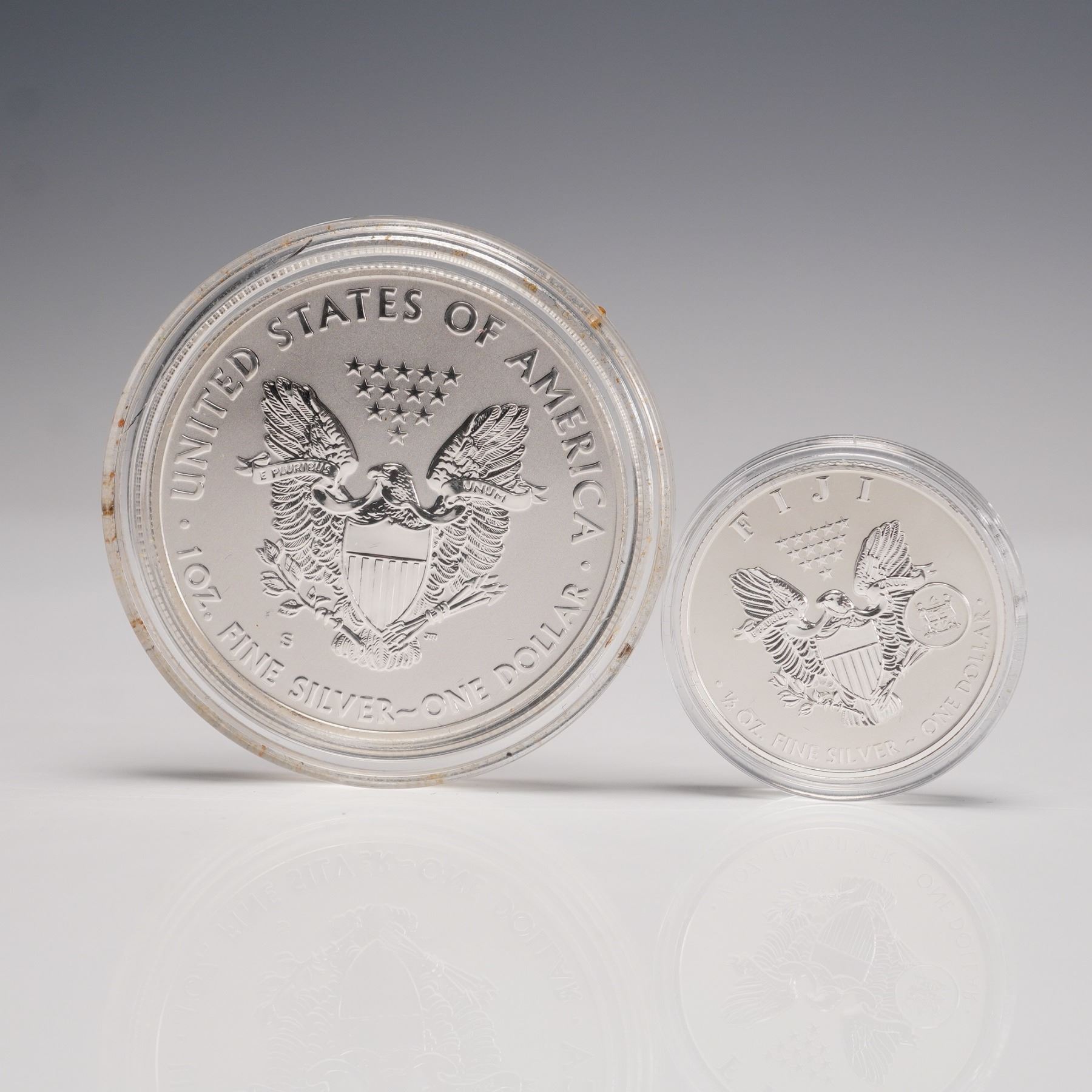 Collection includes a 2012 SAN FRANCISCO MINT 1 OZ FINE SILVER ONE DOLLAR COIN. The obverse depicts the WALKING LIBERTY design by ADOLPH A. WEINMAN, showing a full-length figure of Liberty in stride, draped in the folds of the flag, with her right hand extended and branches of laurel and oak in her left hand. The reverse features the UNITED STATES COAT OF ARMS with heraldic eagle design. Marked 1 OZ FINE SILVER ONE DOLLAR. Set also includes the 2023 FIJI SILVER EAGLE coins in fractional weights: 1/2 OZ, 1/4 OZ, and 1/10 OZ. Each obverse carries the WALKING LIBERTY design by ADOLPH A. WEINMAN. The reverse displays a heraldic eagle, inscribed FIJI along with the FIJI COAT OF ARMS, weight, denomination, and .999 FINE SILVER. Coins are housed in a fitted blue velvet display case. The diameter of the coins are an approximate. 1 oz. coin diameter: 40.6mm. 1/2 oz. coin diameter: 25.4mm. 1/4 oz. coin diameter: 20mm. 1/10 oz. coin diameter: 15.87mm. This item has its original box: 6"L x 4"W x 1"H.