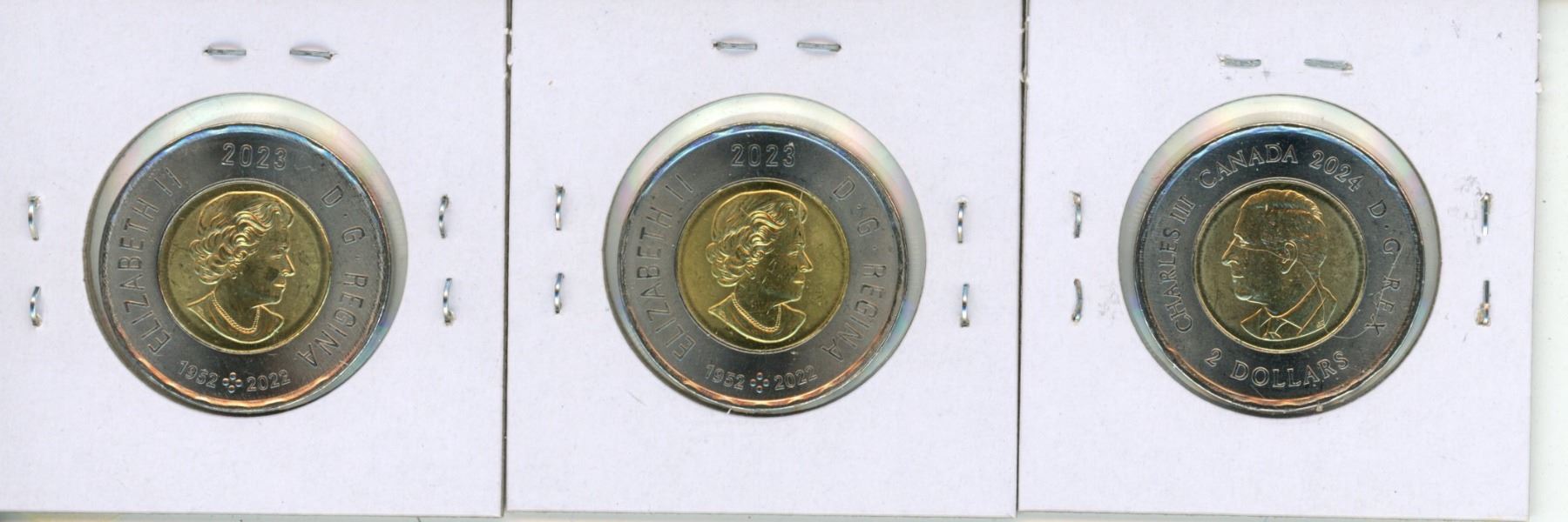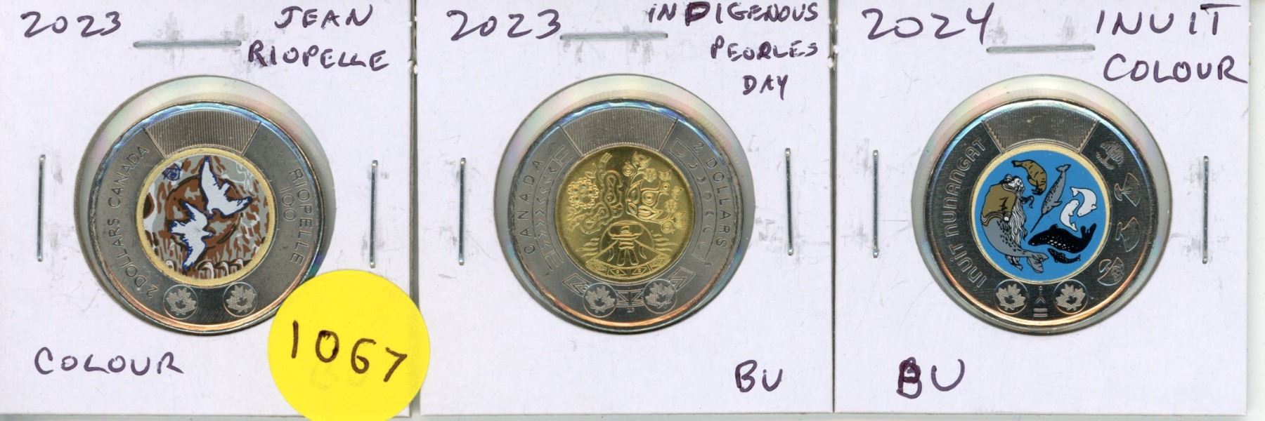 2023 Jean Riopelle $2 Toonie. Colourized. BU, 2023 Indigenous Peoples Day $2 Toonie. BU and 2024 Inuit $2 Toonie. Colourized. BU.