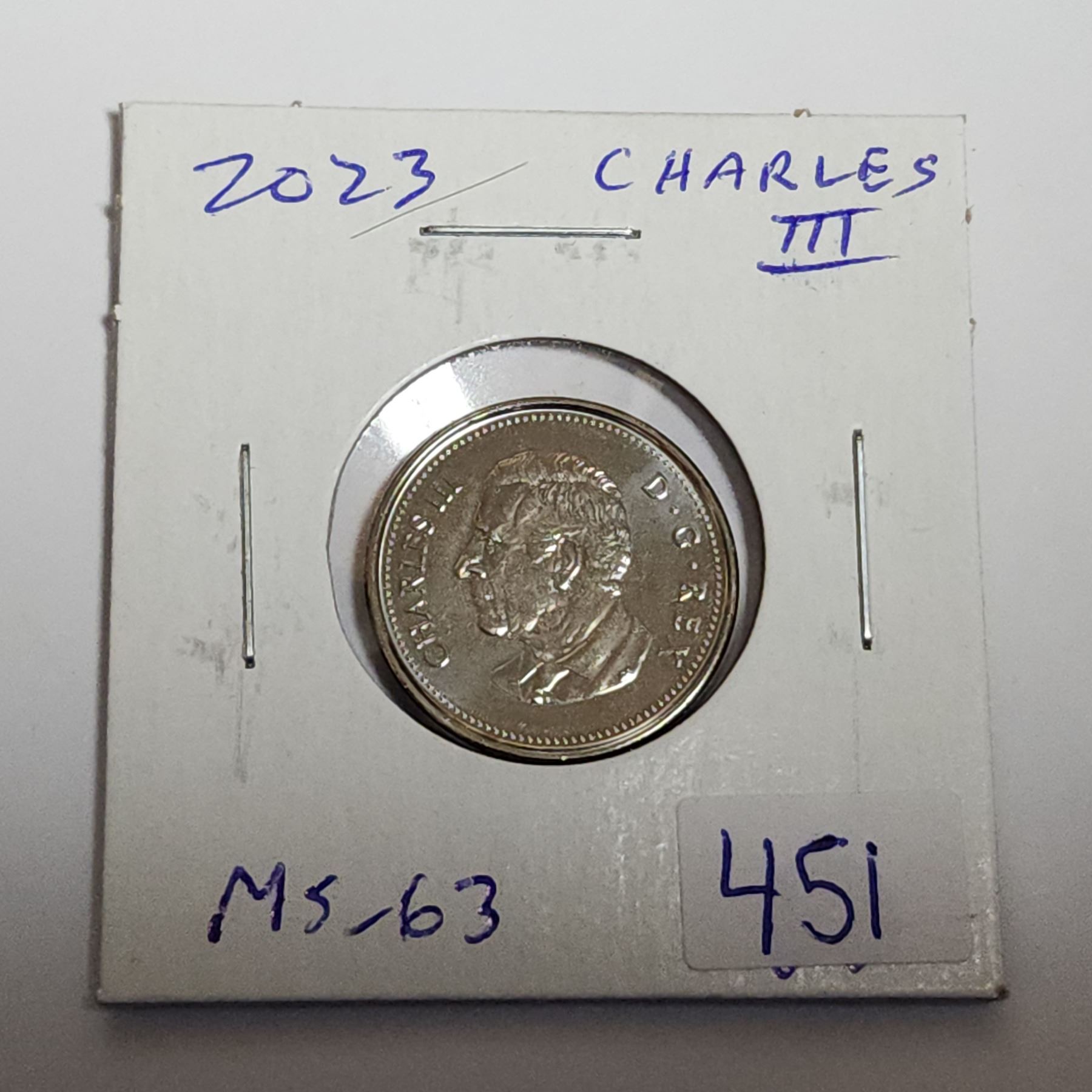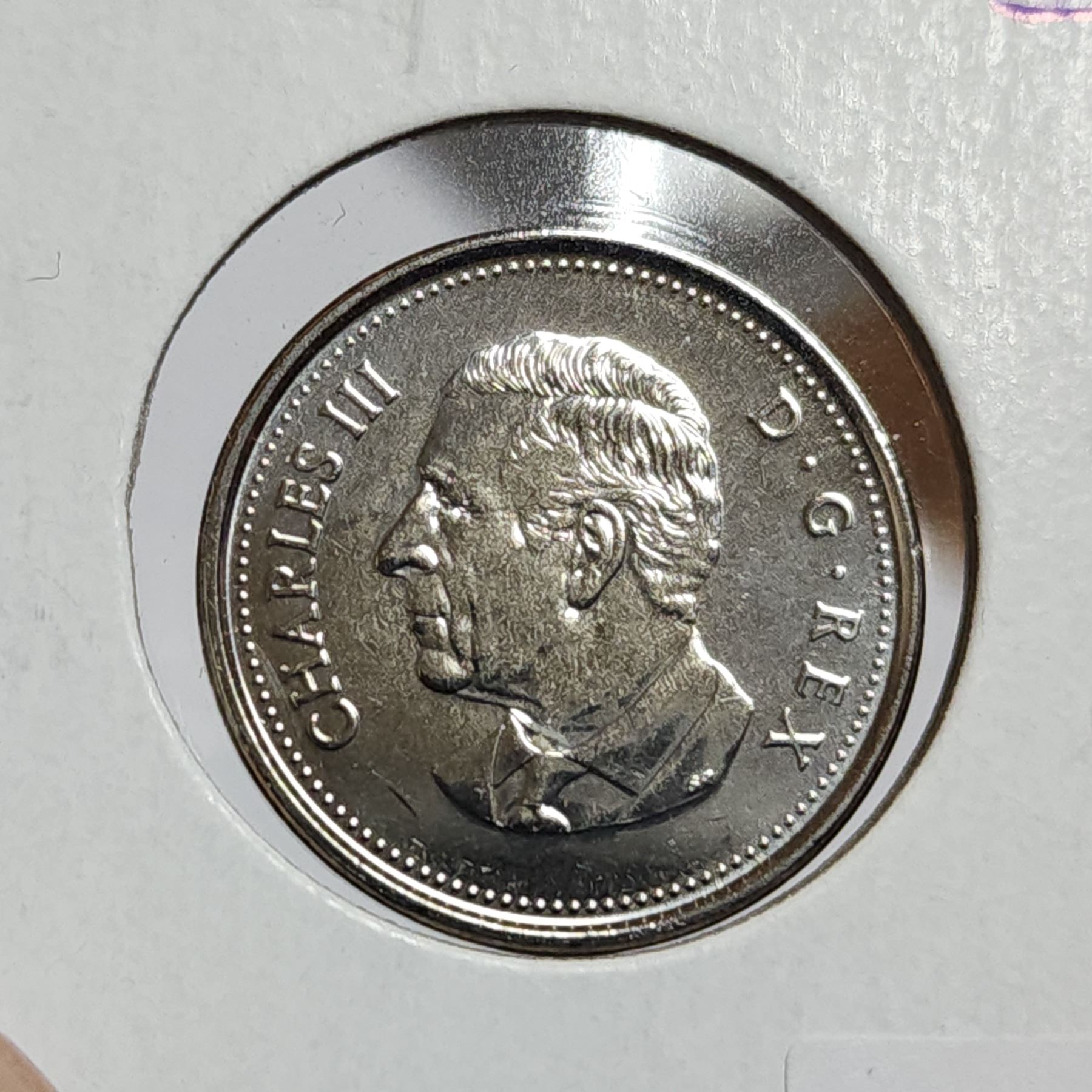 2023 King Charles III 25 Cents. The first issue for the new king. MS-63 from an original Royal Canadian Mint roll.