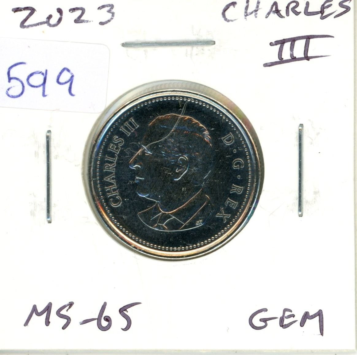2023 King Charles III 25 Cents. The first issue for the new king. MS-65 Gem from an original Royal Canadian Mint roll.