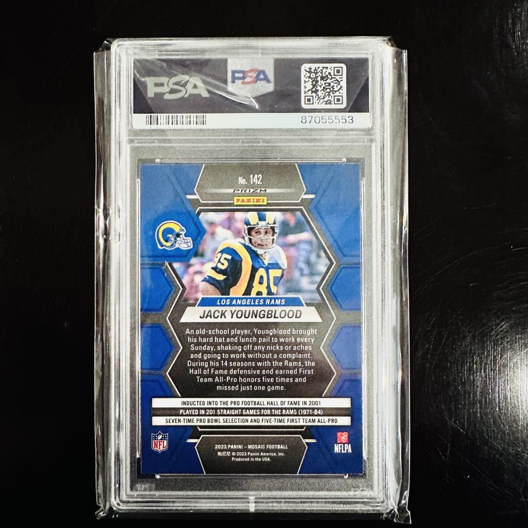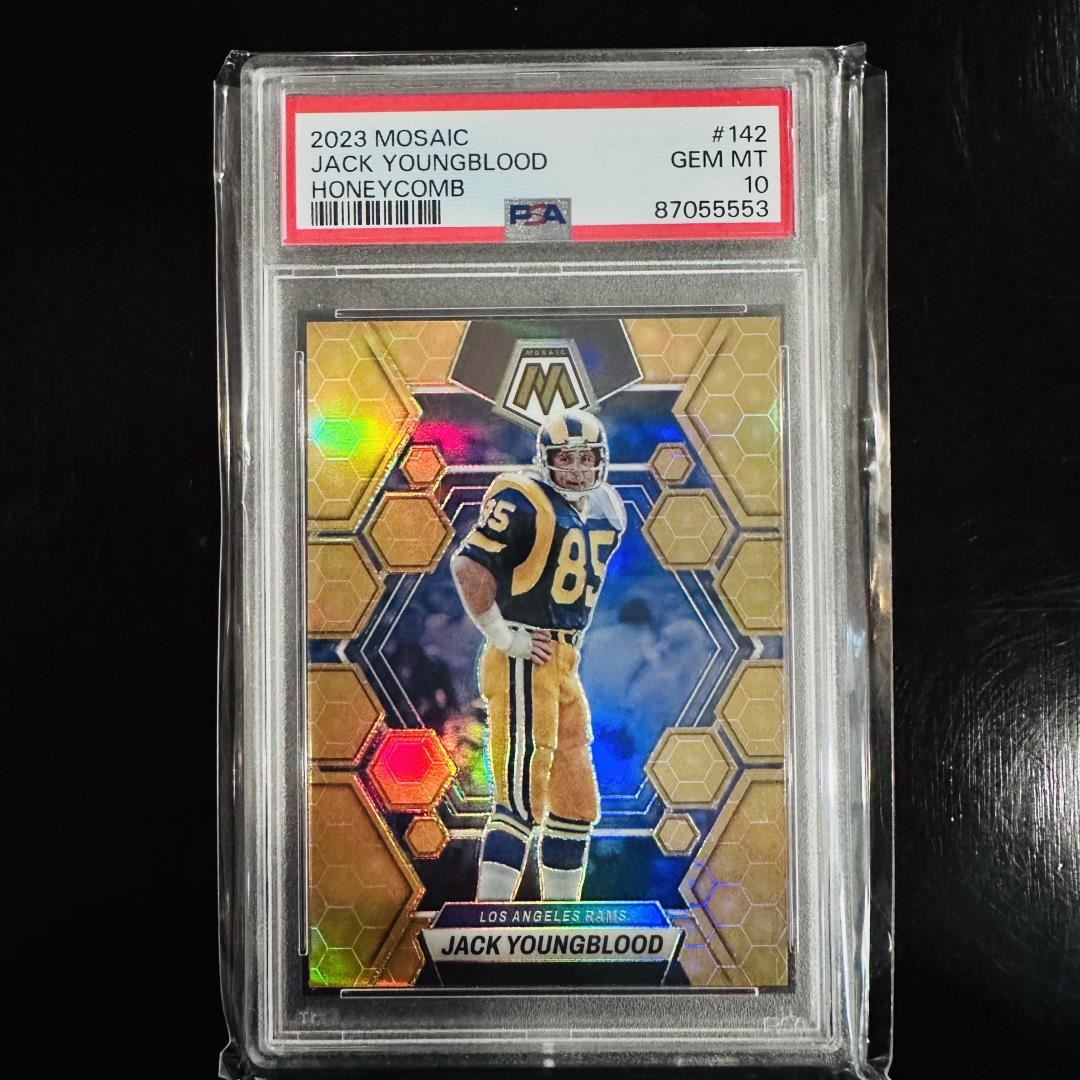 This 2023 Mosaic Honeycomb Parallel card features Hall of Fame defensive end Jack Youngblood in brilliant refractor foil. Graded PSA 10 GEM MINT, the card showcases flawless edges, color, and centering with the iconic honeycomb pattern behind the Rams legend. A modern tribute to a defensive icon, perfect for fans of Mosaic parallels or vintage NFL greatness in contemporary form.